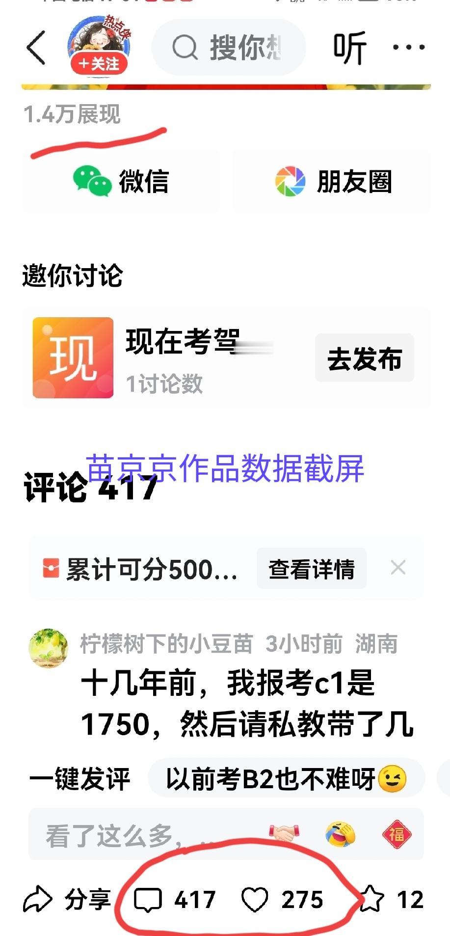 有人说,苗京京的红火是像我们这类人把她宠起来的,我坚决不同意这种说法。 头条这段时间是经常推荐苗京京的作品给我,我刷到了确实会去看一看,但是说实话,我很少给她点赞,至今还没有给她一条评论。 我认为苗京京的红火是她的作品粘性度强,与其他无关,为了证明我的说法是正确的,今天用一组数据来说话。 我昨天的一篇微文展现量是1.3万,评论量是135,点赞量是113,我认为我的这组数据已经够优秀了。 但是也就是刚才,我刷到了苗京京关于考驾照的一篇微文,其展现量是1.4万,与我的展现量基本一样,但她作品的评论量与点赞量数据令我傻眼了,高得离谱,其评论量竟然高达417、点赞量高达275。 这就是差距,同是一篇微文,几乎一样的展现量,人家的是爆款数据,而我的数据仅仅勉勉强强过意得去而已。