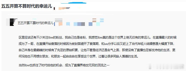 你怎么看?有网友发文:五五开算不算时代的幸运儿区里应该还有不少关注lbw的粉丝,我自己也是老粉,我感觉lbw真的是这个世界上绝无仅有的幸运儿,在直播最火的时候成为了一哥,在直播开始衰落的时候因为被封禁避开了衰落期,和uu分手以后又赶上了当代年轻人结婚意愿大幅度下降,自己本身在最巅峰的时候有了充足的原始积累,让他不管是经济还是名气上面,即使没有了直播也足够支持他的生活,更何况他也不用想女朋友,和朋友一起自由自在享受这个世界,过着让很多同龄人羡慕的生活。当然lbw也抓住了时代给他的机会,成为了直播界绝世无双的顶流之一英雄联盟LPLGumayisi谈战胜T1感想