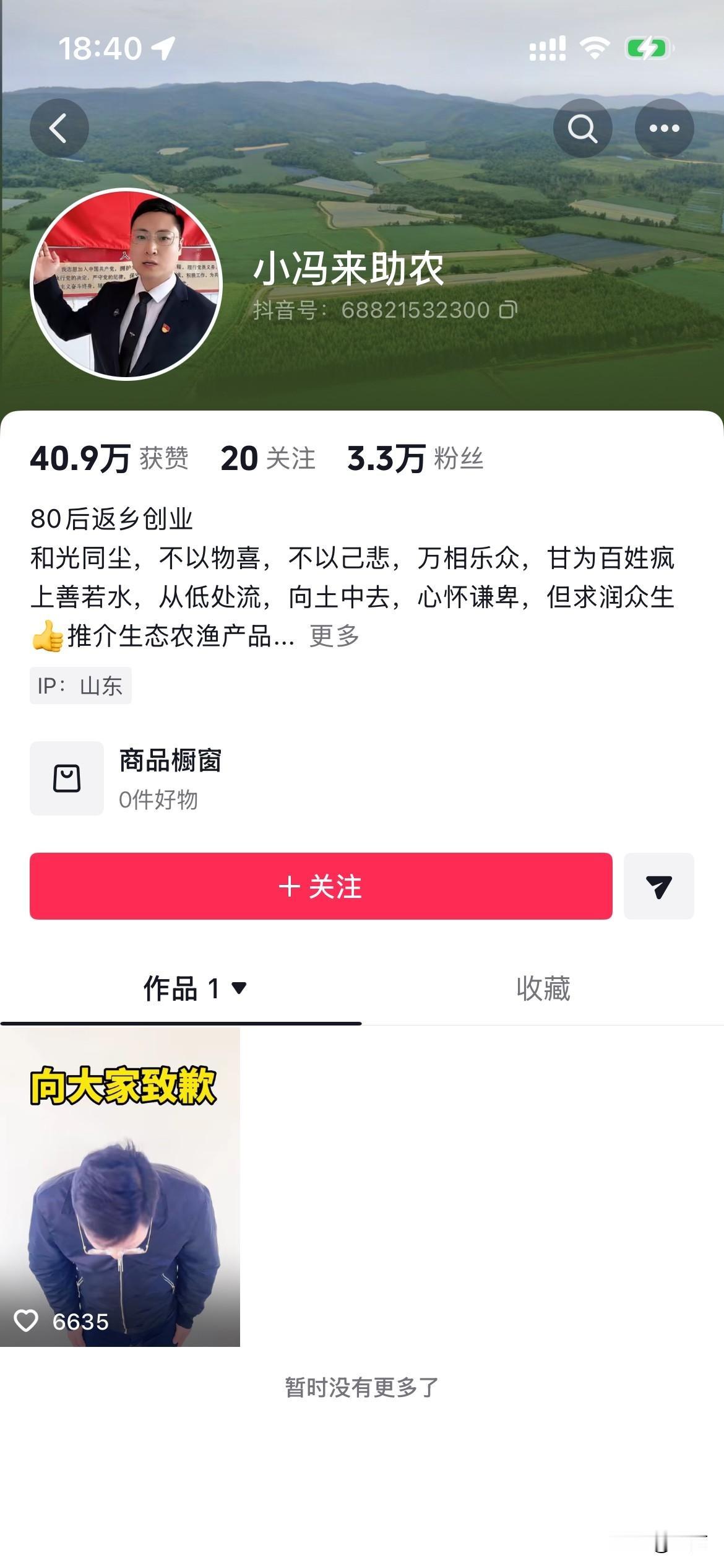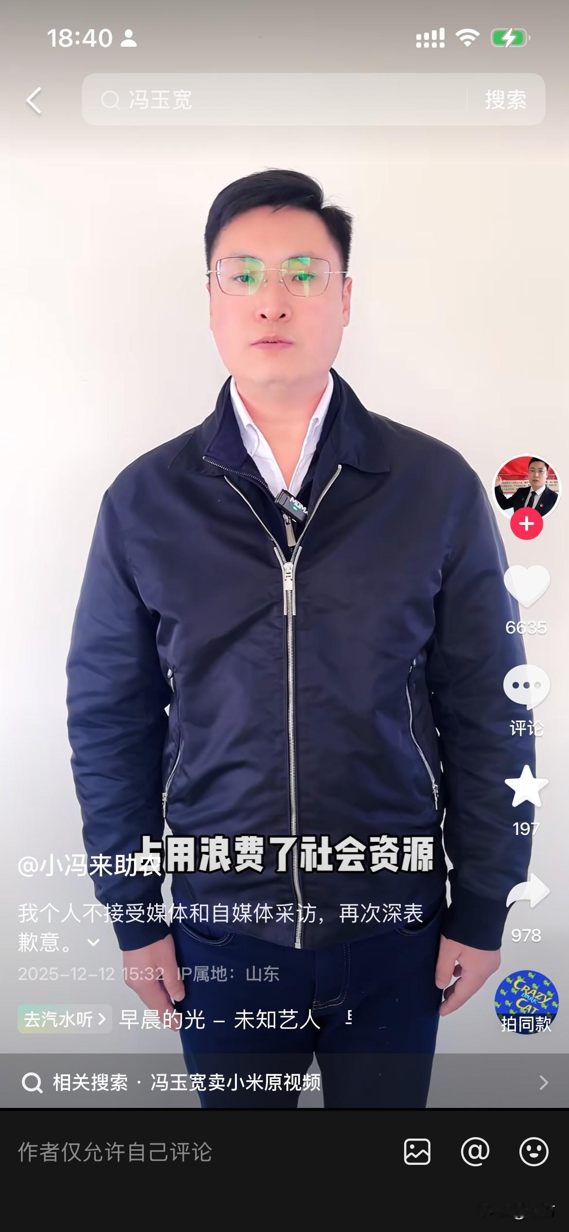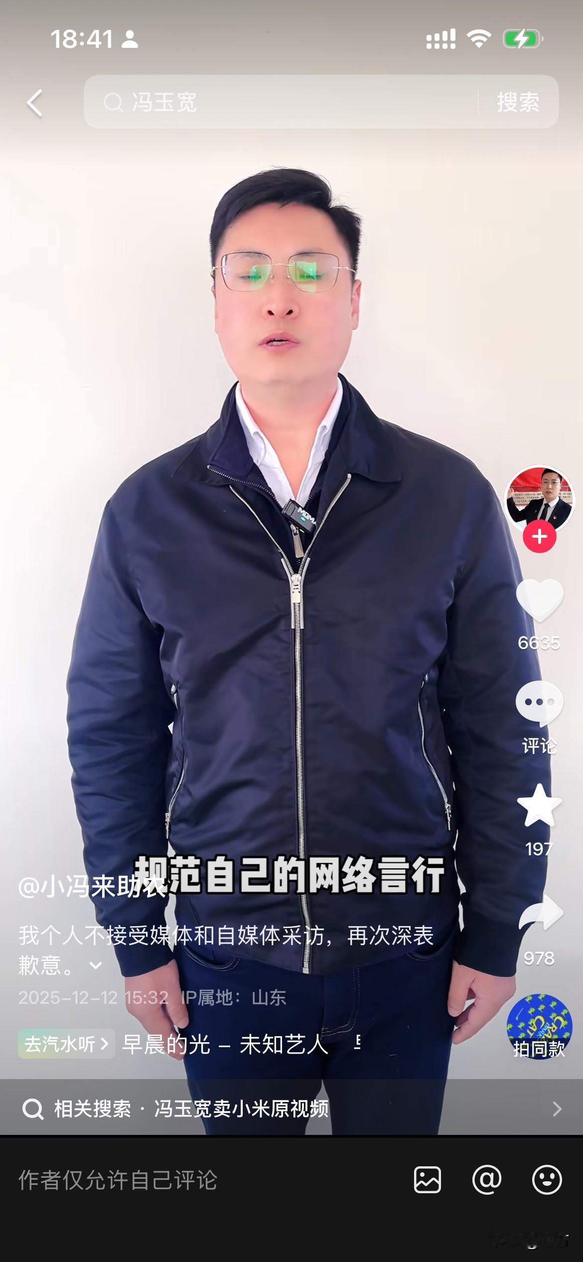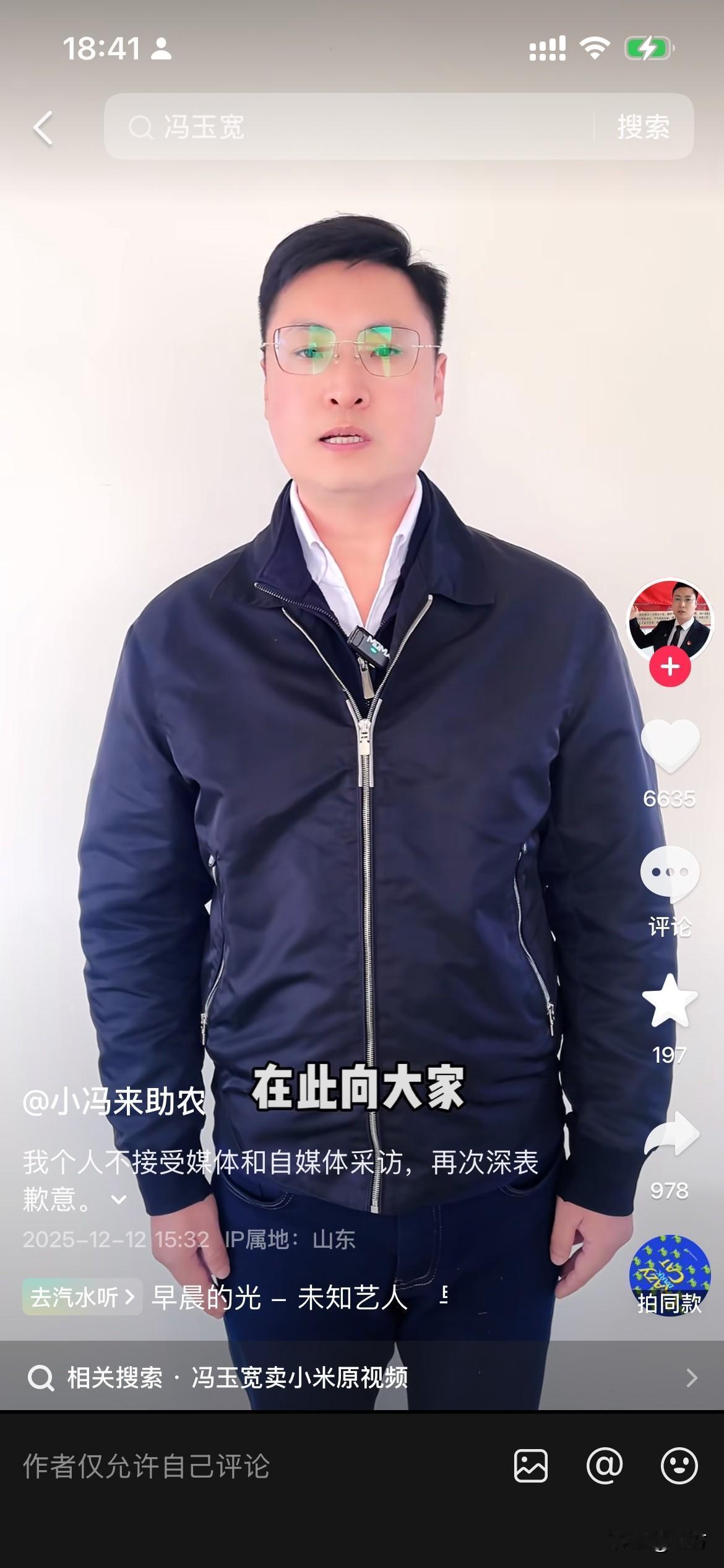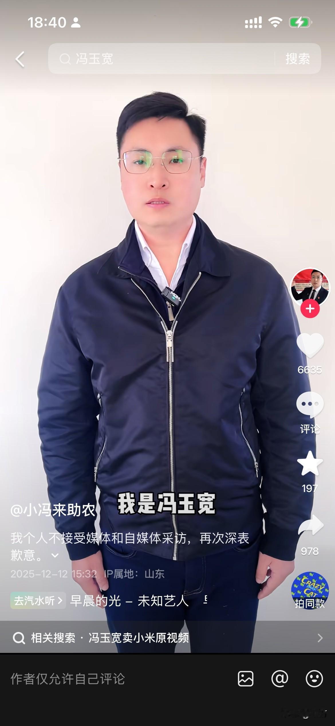 冯玉宽发视频向小米道歉! 就在刚才,冯玉宽在自己的社交网络发了一个道歉的视频。 这个道歉视频是通过他助农的账号,单独发出来的,根据公开信息来看,这个账号有三万多粉丝,IP地址显示在山东,这个账号上面的简介,写得非常明确,他是一个八零后,是一个返乡创业的人。 并没有说他其他的身份,目前这个账号只有他今天发出来的这一个道歉的视频,在这个视频当中,他表示自己在前两天发个视频当中,提到有关小米公司的一些事情,影响了小米公司的声誉,表示他今后会规范自己的言行,不过他道歉的对象,是大家。 他表示自己占用了公共资源,他说自己,这一点是不对的 ,也就是说,他道歉的对象,既有小米公司,也有所有看这个视频的人,和没有看到这个视频的所有的人。 说完之后他深深的鞠了一躬,只是不知道后续小米公司,会不会继续对他进行法律上的责任追究,以及下一步平台会不会对他进行相应的处罚。 而且他当地也在对这个事情进行调查,除了他今天发的这个对外公开的道歉视频之外,看看当地,或者平台,有没有一个最终的通报出来,我们拭目以待。