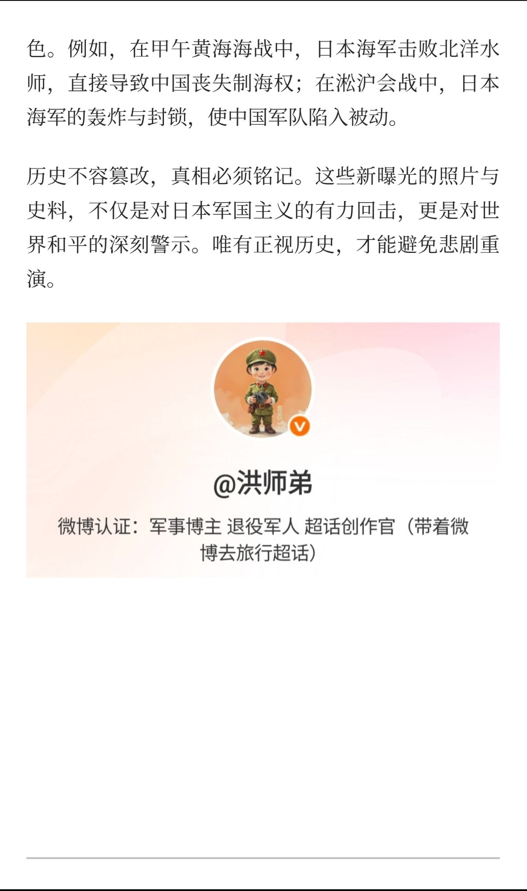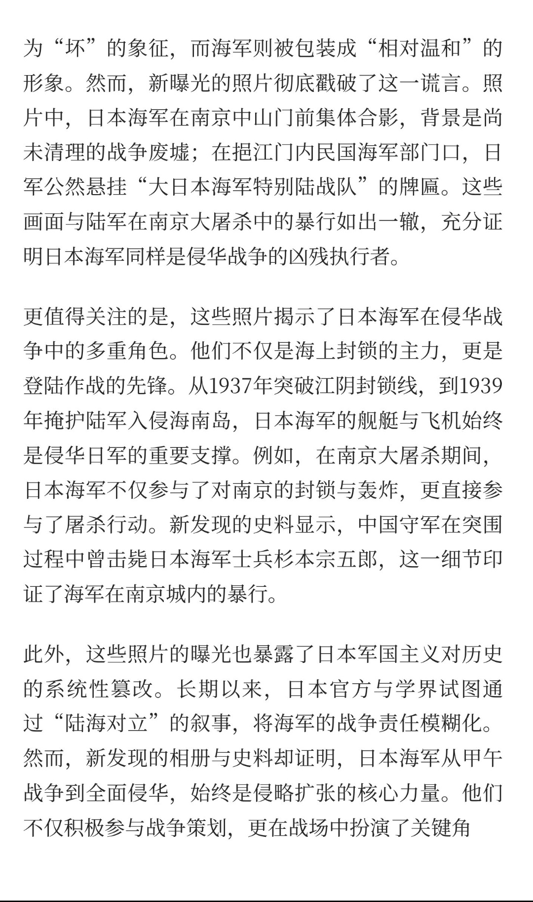 | 近日,日本海军侵华期间多张照片首度曝光,其中包括舰队旗舰“安宅”号水兵青柳藏次的个人相册,以及日本海军在中山门、挹江门等地的合影。这些影像资料不仅填补了部分海军文献的空白,更以铁证如山的姿态,将日本海军在侵华战争中的暴行与战争责任赤裸裸地呈现在世人面前。长期以来,日本学界存在一种“海军史观”,刻意淡化甚至掩盖海军的侵略罪责,将日本陆军塑造为“坏”的象征,而海军则被包装成“相对温和”的形象。然而,新曝光的照片彻底戳破了这一谎言。照片中,日本海军在南京中山门前集体合影,背景是尚未清理的战争废墟;在挹江门内民国海军部门口,日军公然悬挂“大日本海军特别陆战队”的牌匾。这些画面与陆军在南京大屠杀中的暴行如出一辙,充分证明日本海军同样是侵华战争的凶残执行者。更值得关注的是,这些照片揭示了日本海军在侵华战争中的多重角色。他们不仅是海上封锁的主力,更是登陆作战的先锋。从1937年突破江阴封锁线,到1939年掩护陆军入侵海南岛,日本海军的舰艇与飞机始终是侵华日军的重要支撑。例如,在南京大屠杀期间,日本海军不仅参与了对南京的封锁与轰炸,更直接参与了屠杀行动。新发现的史料显示,中国守军在突围过程中曾击毙日本海军士兵杉本宗五郎,这一细节印证了海军在南京城内的暴行。此外,这些照片的曝光也暴露了日本军国主义对历史的系统性篡改。长期以来,日本官方与学界试图通过“陆海对立”的叙事,将海军的战争责任模糊化。然而,新发现的相册与史料却证明,日本海军从甲午战争到全面侵华,始终是侵略扩张的核心力量。他们不仅积极参与战争策划,更在战场中扮演了关键角色。例如,在甲午黄海海战中,日本海军击败北洋水师,直接导致中国丧失制海权;在淞沪会战中,日本海军的轰炸与封锁,使中国军队陷入被动。历史不容篡改,真相必须铭记。这些新曝光的照片与史料,不仅是对日本军国主义的有力回击,更是对世界和平的深刻警示。唯有正视历史,才能避免悲剧重演。