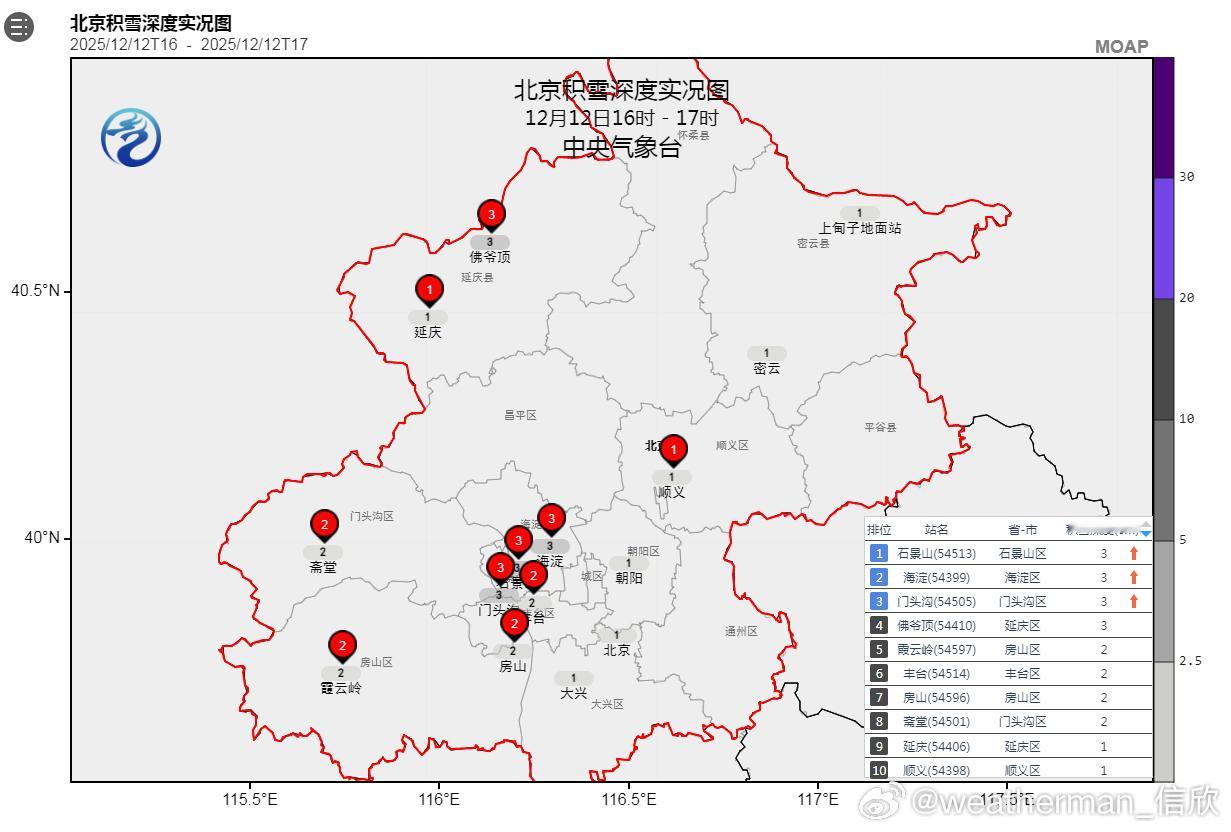北京初雪截至今天17时降雪量(雪化为水),北京佛爷顶3.7毫米、海淀3.2毫米