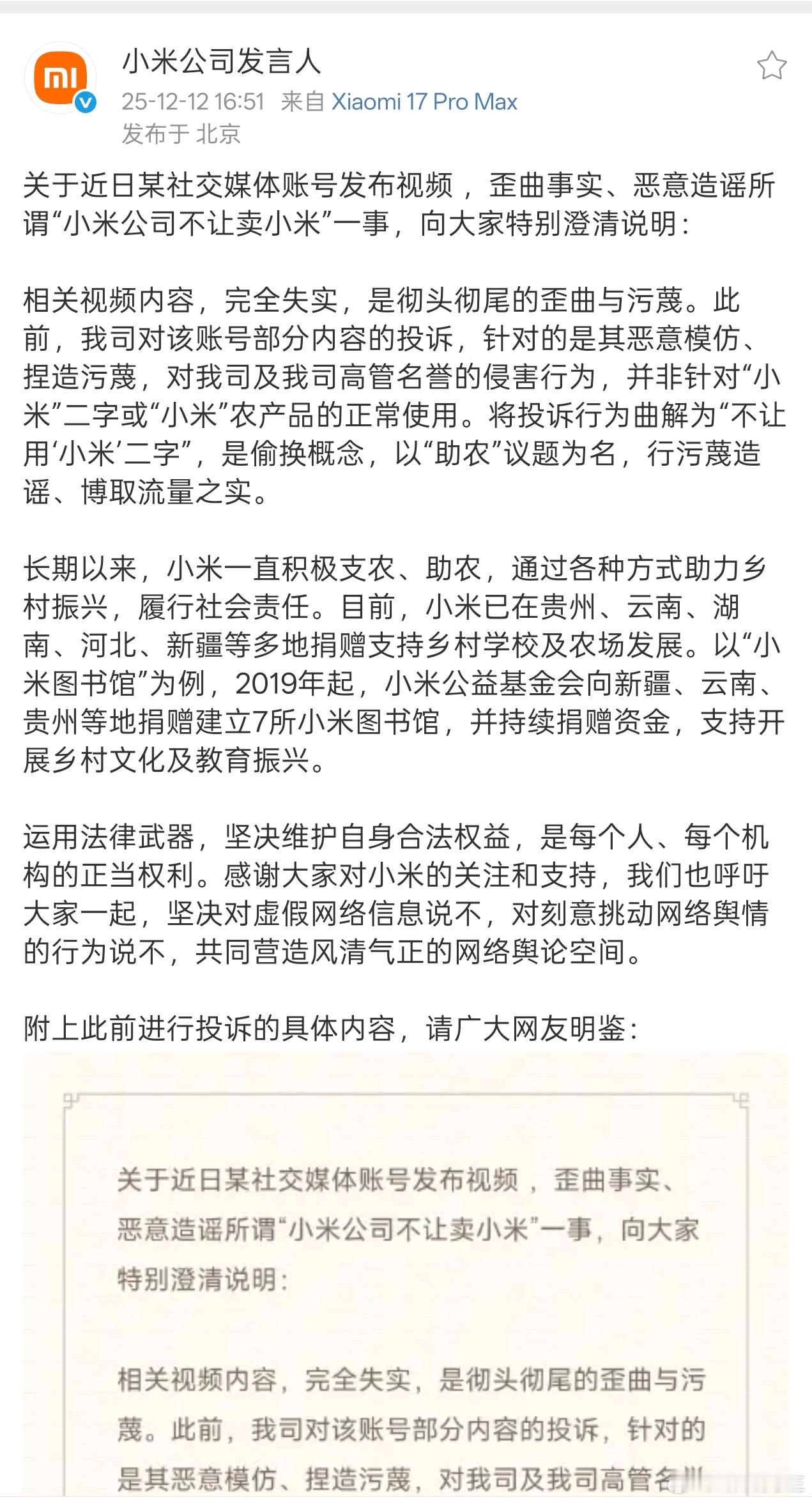 小米公司发言人:对某账号部分内容的投诉,针对的是其恶意模仿、捏造污蔑,对我司及我司高管名誉的侵害行为,并非针对“小米”二字或“小米”农产品的正常使用。将投诉行为曲解为“不让用‘小米’二字”,是偷换概念,以“助农”议题为名,行污蔑造谣、博取流量之实。