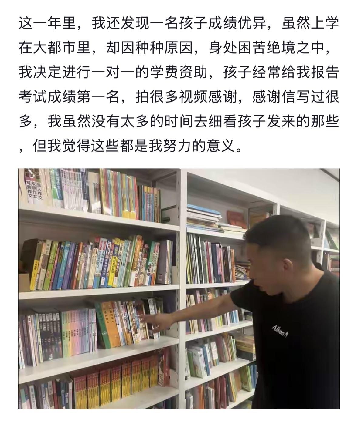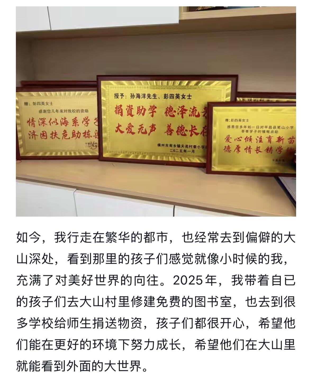 原来孙海洋“偷偷”捐了那么多钱!他给山区孩子修建了免费的图书馆,取名“孙悦书屋”;他资助了一个品学兼优的孩子,时常收到孩子报喜说自己拿了第一名的感谢信;他为一个残疾人租了有电梯的房子,让他不必再手脚并用的爬楼梯。 孙海洋很能干,他要赚很多很多的钱,包子铺、家纺店、直播带货……说实在的,他的生活,在深圳,过得相当朴素。没有豪宅,更无豪车,也不见什么奢侈品。很长一段时间,一家人踏踏实实地住在城中村里。 可他总是在自认为要冲在前面的时候冲在前面,无论是寻亲,还是寻亲后做的各色公益。 那个当初进城连和大巴司机说一句停车都不敢的青年,如今把三个孩子培养的落落大方,在苦寻孙卓十余年的苦难里,淬炼出不屈坚韧又大爱的灵魂。