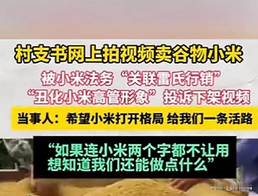 这事儿也太离谱了! 村支书卖小米! 被小米公司投诉下架? 陕西一位村支书拍视频卖自家产的谷物小米,结果收到小米法务的投诉——理由是“关联雷氏行销”“丑化小米高管形象”,直接把视频弄下架了。 村支书急得直叹气:“要是连‘小米’这俩字都不让用,我们还能做啥?”他只是想帮村里卖农产品,没蹭品牌也没恶意,却被企业的商标维权堵了销路,只能喊话“希望小米打开格局,给条活路”。 其实“小米”本是粮食通用名,企业商标维权没错,但碰上农民卖真·小米,这维权就显得有点“一刀切”——农户没能力搞复杂的品牌规避,就想踏踏实实用常用名卖货,结果撞上大企业的商标壁垒,实在有点冤。 现在网友都在替村支书喊冤:企业护品牌没错,但也得给小农户留条实在的路吧?