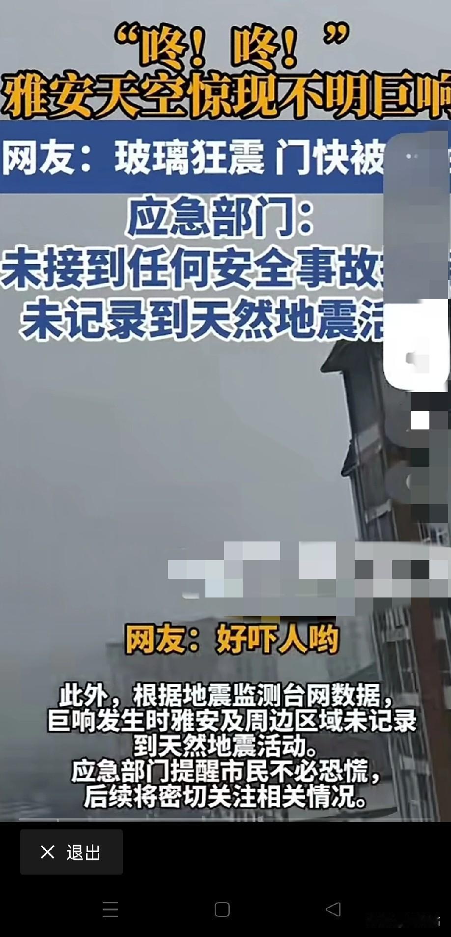 快讯!!!! 12月12日傍晚,雅安不少市民正待着,突然一阵闷响砸下来——窗户晃得嗡嗡颤,连门都跟着抖了抖,不少人吓出一身冷汗。可转头看应急部门通报:没安全事故、没地震,地震台网连个波动都没测着。 这“凭空来的巨响”其实不罕见,大概率是这几类情况:比如军用飞行器超音速飞行时的“音爆”,冲击波砸到地面就是这种撼人的动静;或是工业区域的大型爆破、设备试车,只是没提前通知;也可能是强雷暴的“超级雷声”,闷在云层里传出来就格外响。 现在应急部门已经喊大家别慌,后续会盯着查原因——多半是常规操作没提前说,只是动静闹大了而已。