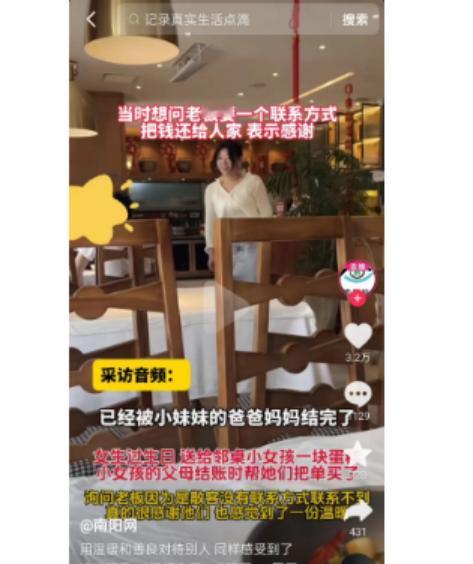 泪目了!内蒙古包头一家餐厅里,小女孩趴在妈妈腿上,眼睛一眨不眨盯着邻桌的小猪造型蛋糕,口水差点滴到地上。 妈妈小声哄着“我们下次再买”,可那渴望的小眼神,还是像根细针,轻轻扎在了邻桌过生日的姑娘心上。 那天是淳子的生日,刚吹灭蜡烛,就注意到斜对面那桌的动静。 小女孩最多四岁,手指偷偷指着蛋糕上的小猪鼻子,妈妈尴尬地把她的手按下去。 淳子没多想,切下最大一块蛋糕,用餐厅的打包盒装好递过去。 “小朋友,这个送给你,祝你天天开心呀。” 女童妈妈愣了一下,连声道谢,小女孩抱着蛋糕笑得露出两颗小虎牙。 淳子以为这事就结束了,吃完结账时却傻了眼。 服务员说,她的单二十分钟前就被那对夫妻结了。 “他们说‘遇到好心人,这点心意不算啥’,还留了张纸条。” 纸条上是歪歪扭扭的字迹:“谢谢你让孩子知道,原来陌生人也会分享快乐。” 淳子把这段经历发在抖音,评论区瞬间陷入争议,有人说“这才是双向奔赴”,有人晒出自己类似的经历,买咖啡时帮陌生老人付了钱,第二天收到对方送来的一袋自家种的苹果。 其实这样的事,这些年悄悄多了起来。 去年成都有个面馆老板,看环卫工大爷总在门口躲雨,就每天留一碗热汤面。 后来大爷攒了一篮子土鸡蛋送来,说“你暖我胃,我暖你心”。 还有杭州地铁站,有人把伞落在共享伞桩,特意贴张纸条“伞骨有点松,用的时候小心”,下一个用伞的人,用完后又在纸条上加了句“已修好,放心用”。 这些小事不上新闻,但像春天的草,在城市的缝隙里悄悄长。 陌生人之间的信任,有时候就像薄冰,好像碰一下就碎。 可淳子和那对夫妻证明,冰面上也能开出花。 她送蛋糕时没想过回报,对方买单时也没图感谢,这种“没目的”的善意,反而最有力量。 就像往湖里扔颗石子,波纹会一圈圈荡开,有网友说要学淳子,下次遇到想吃冰淇淋却没钱的小孩,也买一支;还有餐厅老板留言,要在店里设“爱心蛋糕角”,让过生日的人可以分享一小块给有需要的人。 那块小猪造型的蛋糕没吃完,淳子把剩下的打包带给了路边的流浪猫。 手机里存着女童妈妈后来发来的照片:小女孩把蛋糕上的小猪鼻子拆下来,非要塞给幼儿园的小朋友。 “她说这是‘分享魔法’,要让每个小朋友都有。” 原来善意真的会传染,像蒲公英的种子,风一吹,就能在意想不到的地方发芽。