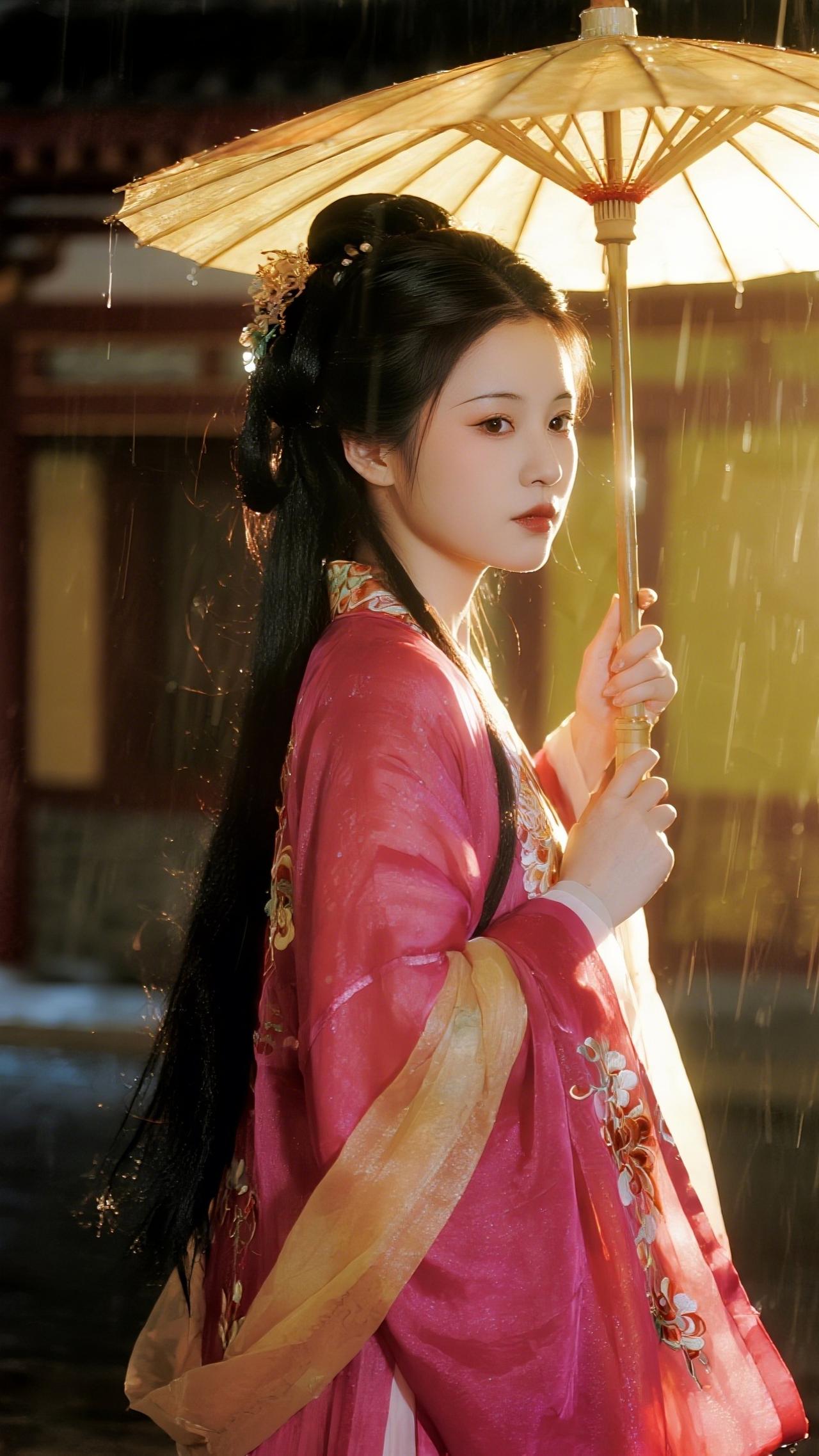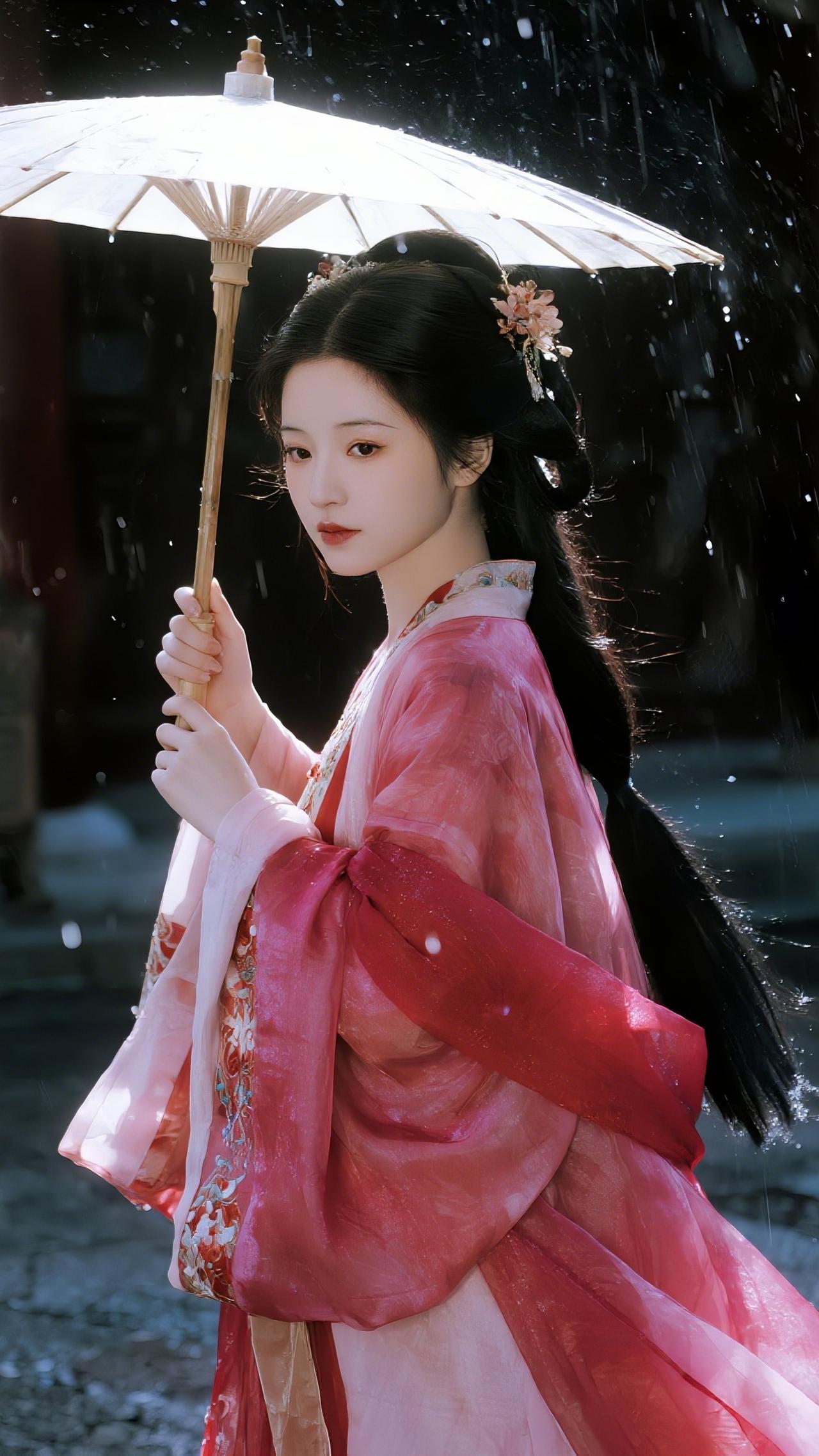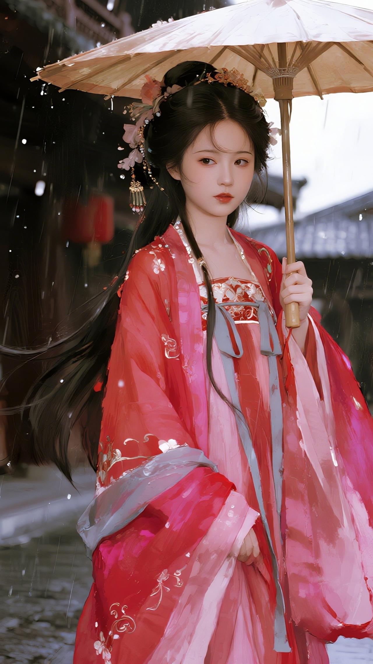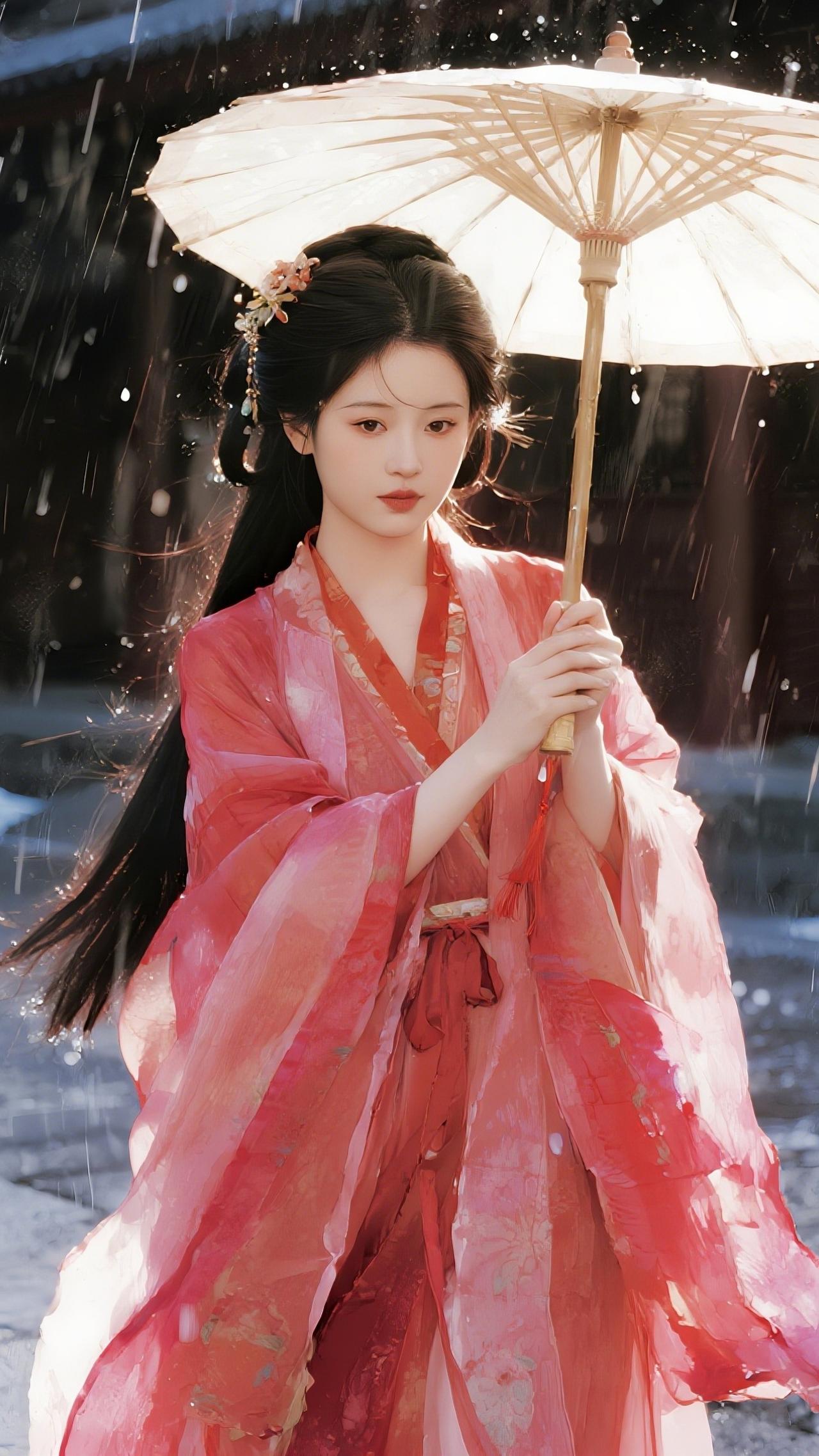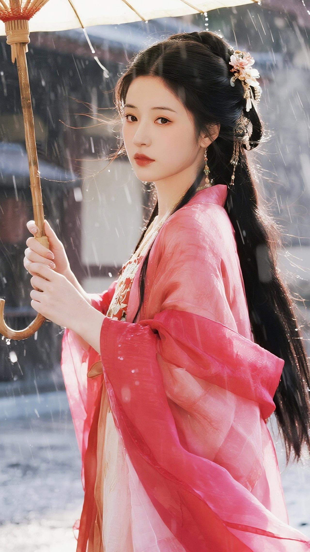 雨中漫步,撑伞少女,古风唯美这幅雨中漫步的撑伞少女古风壁纸,仿佛将人带入了一个诗意的江南梦境。细密的雨丝如银线般纷纷扬扬地飘落,洒在青石板的街道上,溅起一朵朵小小的水花。 撑伞的少女身着一袭淡蓝色的古风长裙,裙摆随着她轻盈的步伐微微飘动,似是一朵在雨中摇曳的兰花。她手中那把油纸伞,绘着淡雅的水墨图案,在雨幕中宛如一朵盛开的花,为她遮挡着风雨。 少女眉眼如画,眼眸中透着一丝淡淡的忧愁,仿佛藏着许多不为人知的心事。她微微低头,长长的睫毛上挂着晶莹的雨珠,更增添了几分楚楚动人的韵味。 在她的身旁,是古朴的建筑,斑驳的墙壁在雨水的冲刷下显得更加沧桑。屋檐下的水珠滴答滴答地落下,与少女的脚步声交织在一起,奏响了一曲美妙的乐章。 每当看到这张壁纸,内心都会瞬间变得宁静而祥和,仿佛能感受到那股清新的雨意和淡淡的古风气息。它就像一把钥匙,打开了通往古代诗意世界的大门,让人沉浸其中,忘却了尘世的喧嚣与烦恼。这样充满意境的古风壁纸,真是让人百看不厌,喜欢至极啊!
