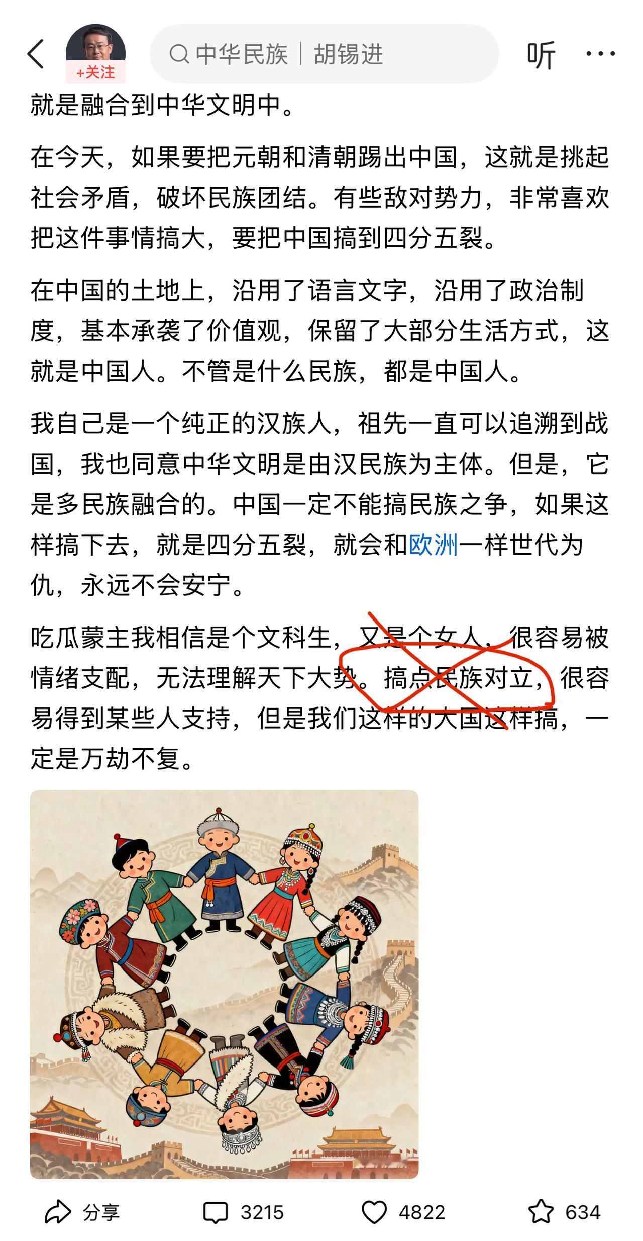 吃瓜盟主没有给元清是否是正统性下结论,也从未说过元清非中国。 这位“立刚…”的博主上来就给“吃瓜盟主”扣上一个“重大政治错误”的帽子。这谁啊?好大的官威,好大的口气,一介商人不好好做自己科技,竟然代表官方给别人做政治审判。发个万字长文就觉得自己有理了?水牛拉屎一大堆,泻(写)的多就不臭吗?连满清和满族都分不清的货色,就把满清和满族划上等号,强行捆绑概念、混淆视听,搅浑水给别人扣大帽子。连基本的历史常识和小学的阅读理解能力都没有,就断章取义、造谣攻击“吃瓜盟主”。 关于元清正统性争议的那一节视频中,“吃瓜盟主”没有下任何结论,跟本没有说元清非中国,相反她特别强调元、清两个朝代都是中国历史的一部分!对元清正统性并未给出直接结论,原视频还在网上能见到呢,就开始歪解造谣。到了“立刚…”嘴里成了“否定元清正统和元清不属于中国”这样的谎言,她甚至把满清和满族的概念做了明显切割,把满族的历史渊源和基因传承讲的一清二楚,满族先民多数也是汉族移民,满汉两族早就是血脉相连。满清代表的是满清贵族,跟普通满族百姓不是一个概念。硬要理解成“搞民族对立”,不是无知就是坏。她也没有攻击过其他博主,相反,那些群起攻击她的嘴上爱国博主才是坐实了在搞对立,不过是因为引走了他们的流量,动了他们的利益。 “吃瓜盟主”只是一颗种子,批的是满清朝廷,还原历史真相,唤醒汉魂,唤国人觉醒,唤国人自信自强。她的视频里摆事实讲道理,有理有据。而不是像一些大V只讲观点不讲逻辑,上来就下结论给人家扣帽子。不学无术、认知低洼的人曲解别人的思想本意,还洋洋洒洒去造谣抹黑一个学识渊博的人,手法既拙劣又贻笑大方!