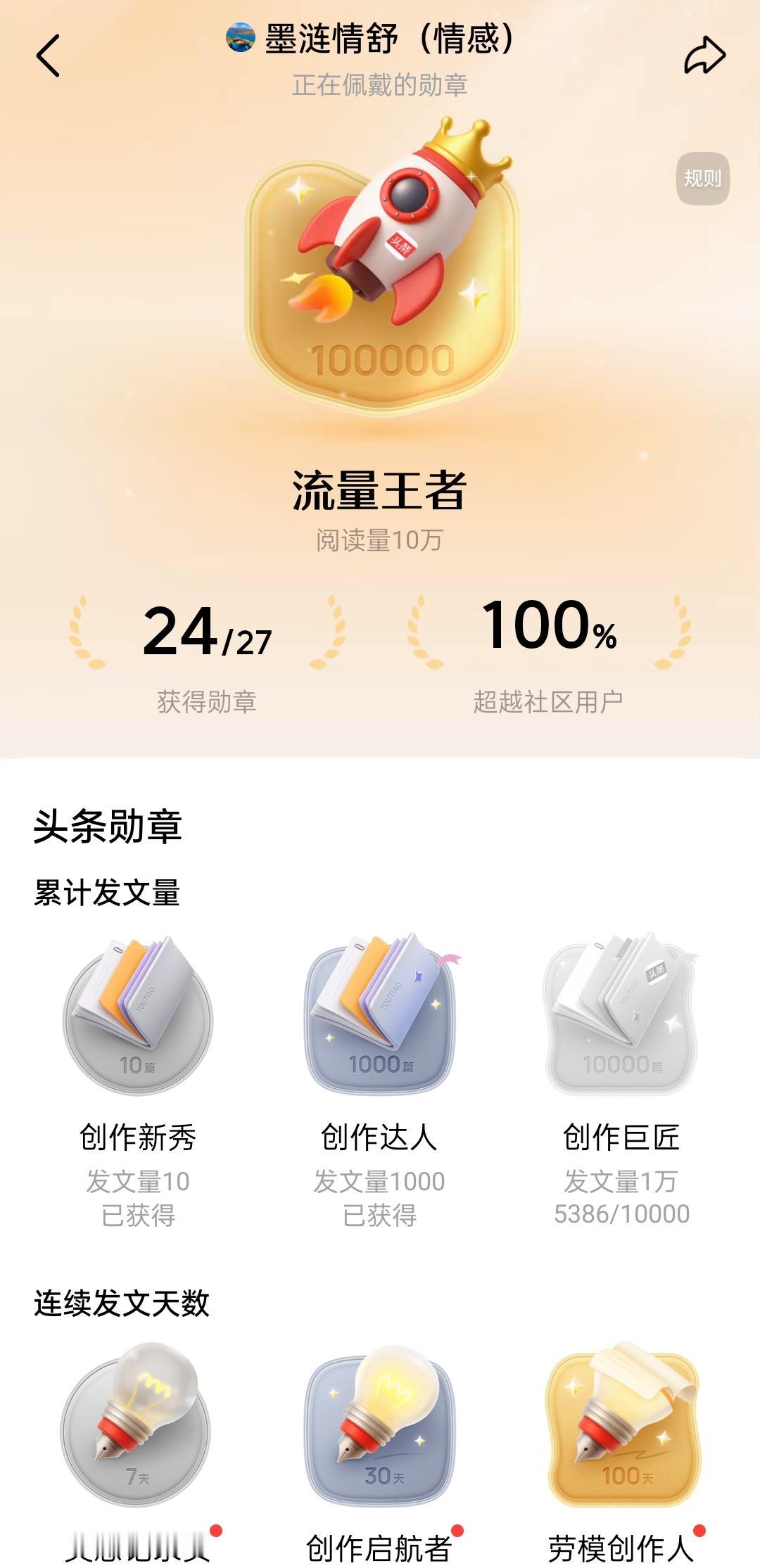 今天突然看到头条勋章 发现自己不知不觉 已经在头条上获得了24枚勋章了 并且还能在已获得的勋章中 挑选出任意一枚佩戴 于是乎我从24个勋章里面左挑右选 还是感觉流量王者这个勋章最霸气 希望以后流量多多,收益多多 大家一起加油吧!