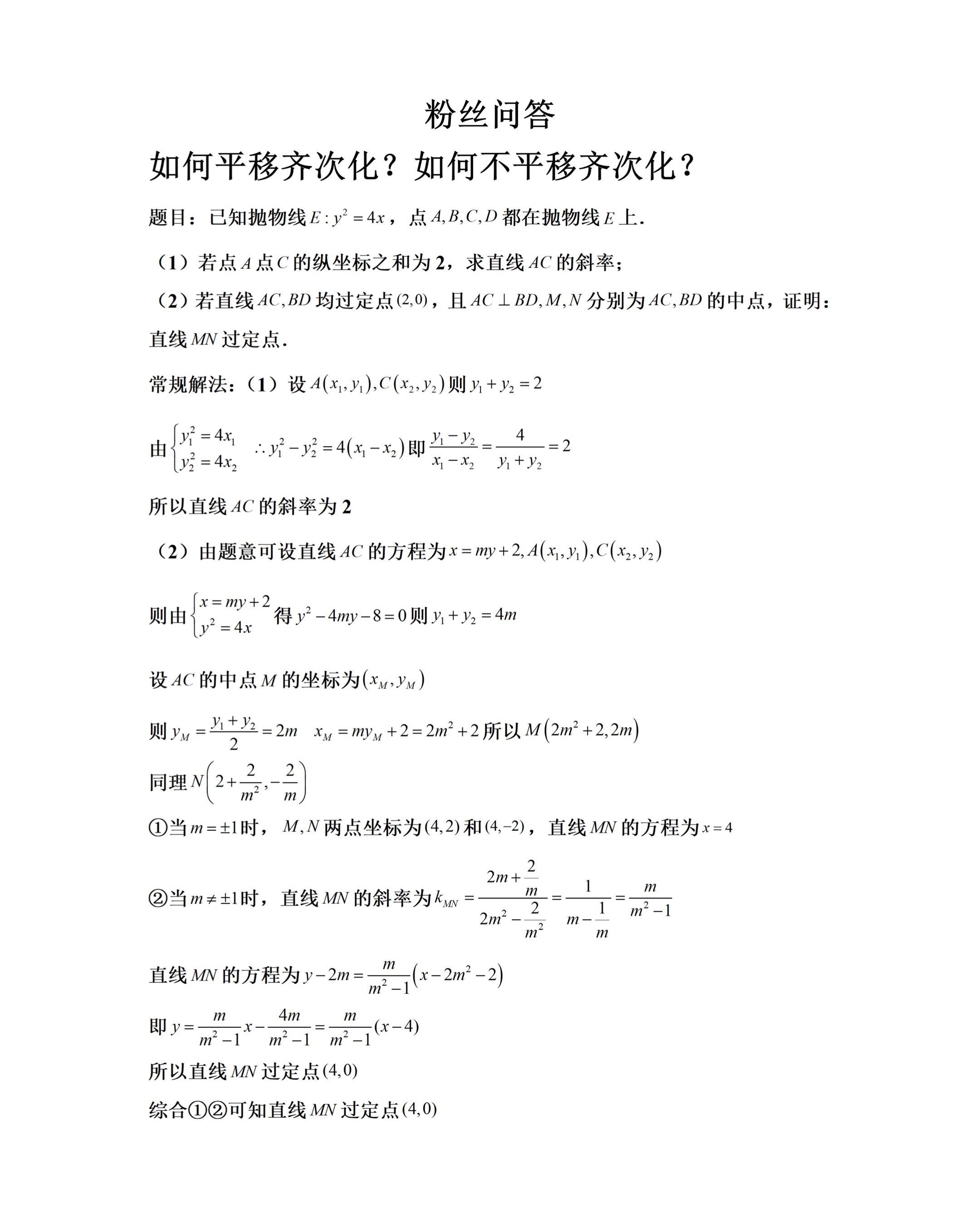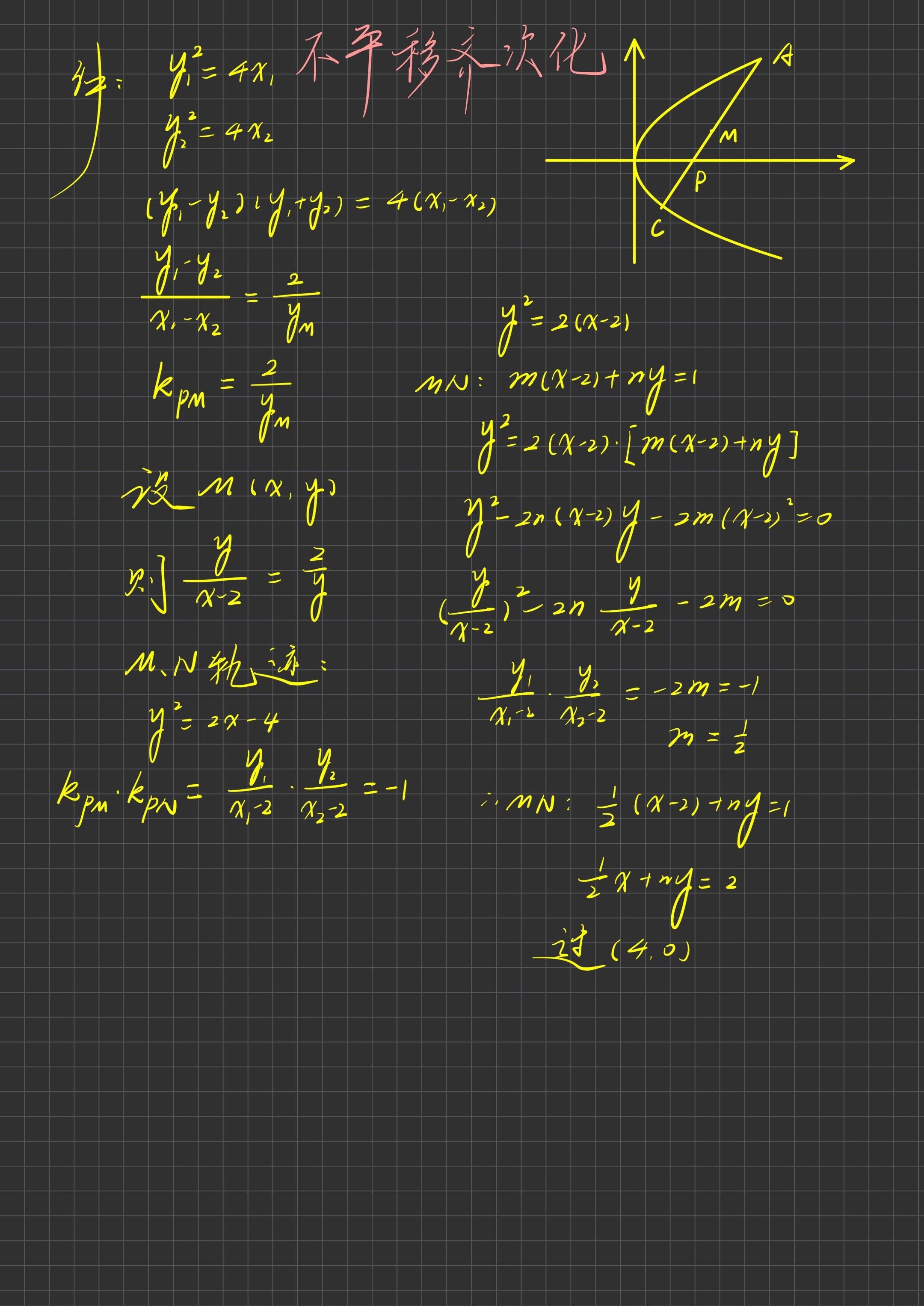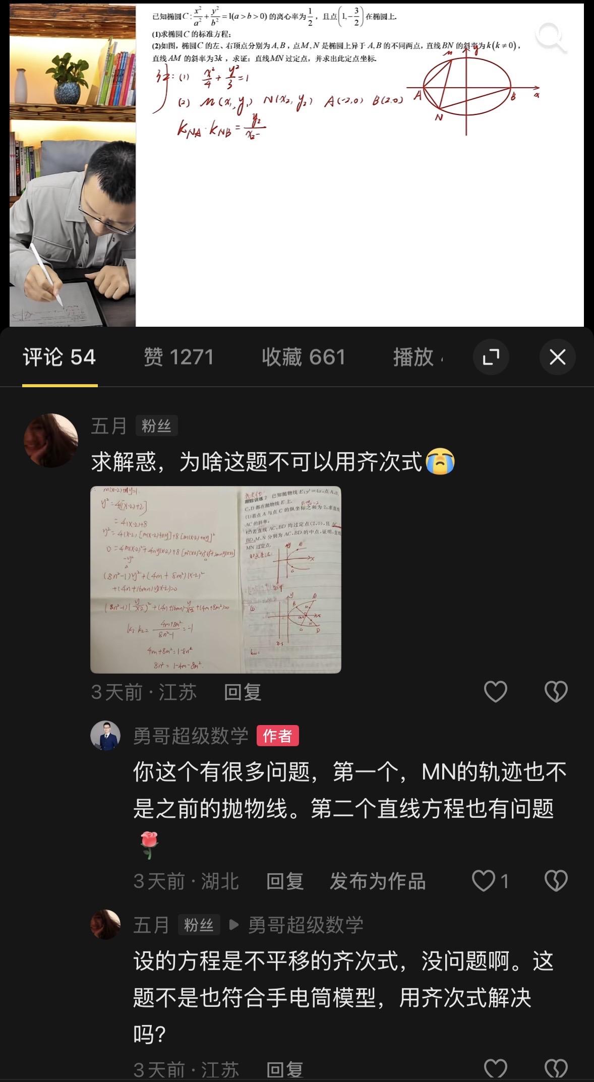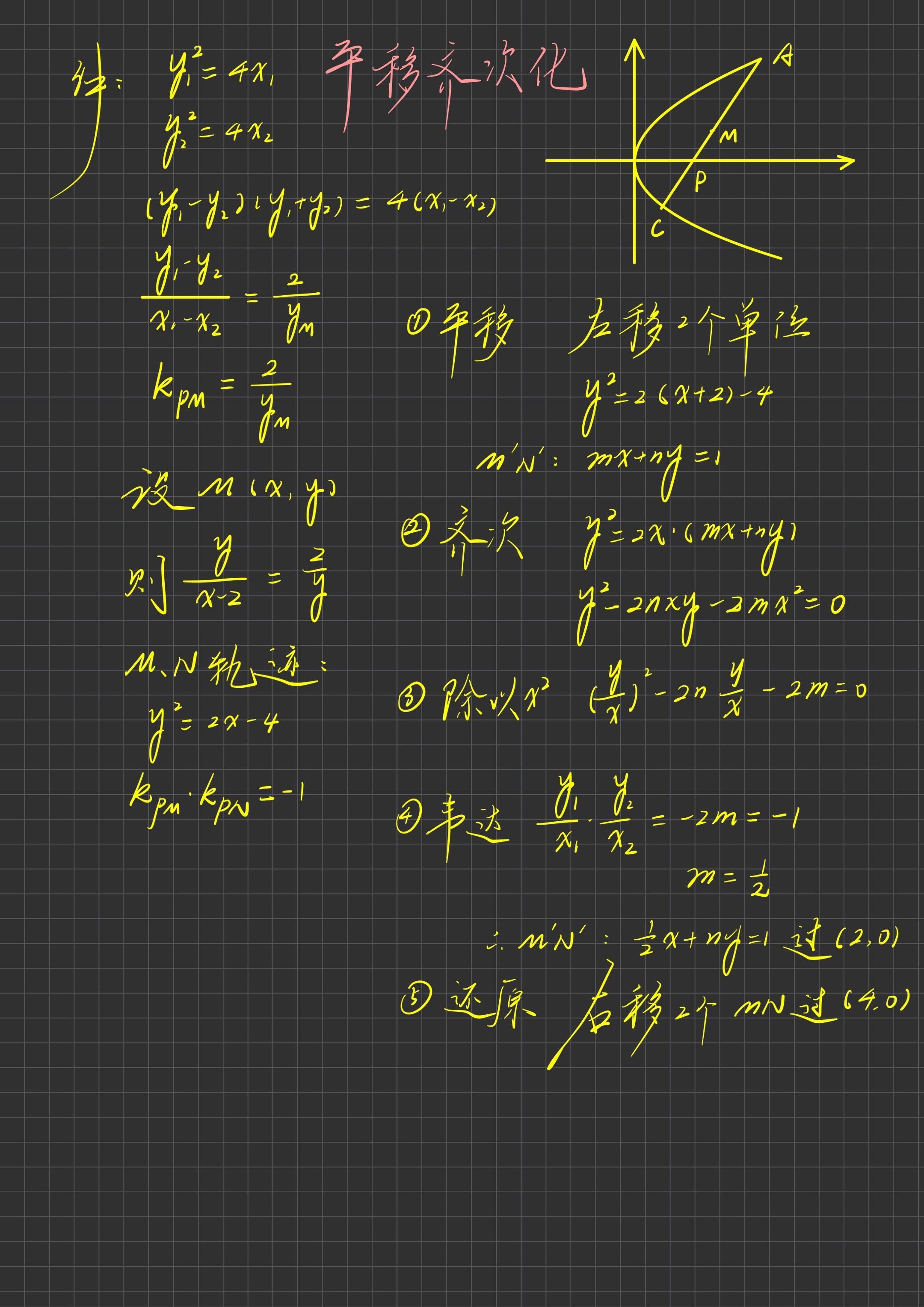 答粉丝提问。回复一下你的问题,平移齐次化和不平移齐次化的步骤,首先,动点轨迹一定在曲线上,再去齐次联立。希望对你有帮助。