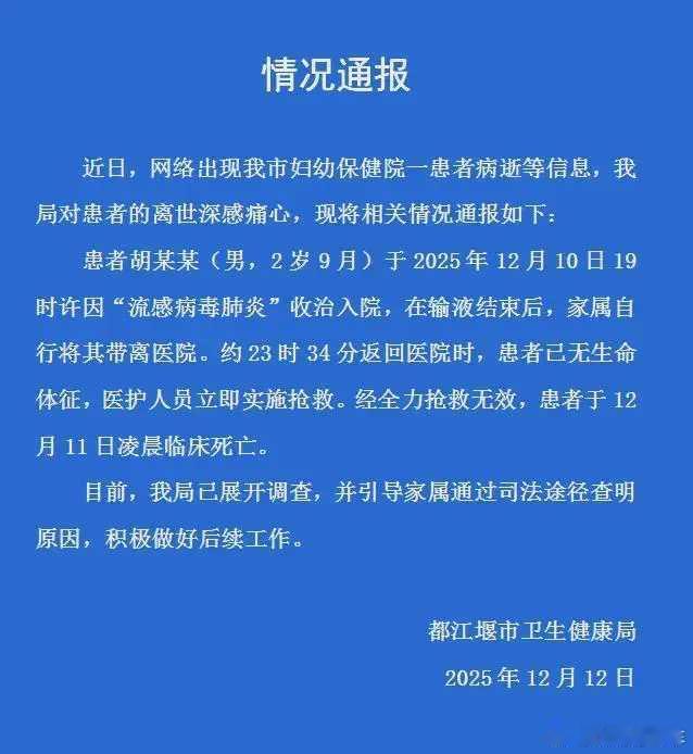 2岁男童输液后死亡 小孩子的“流感病毒肺炎”真的危险,家长一定不能掉以轻心小朋友,19时许因“流感病毒肺炎”收治入院,在输液结束后,家属自行将其带离医院。约23时34分返回医院时,患者已无生命体征。我们无法得知离院这四个多小时到底发生了什么?到医院时已无生命体征,说明小朋友输液回家不久就已经出事了。家长难辞其咎:如果早点发现,早点送医,不至于如此严重。父母带孩子,一定要小心又小心啊日常