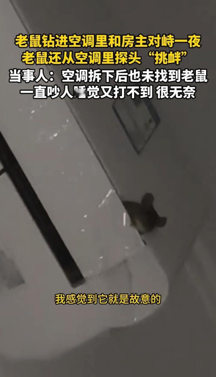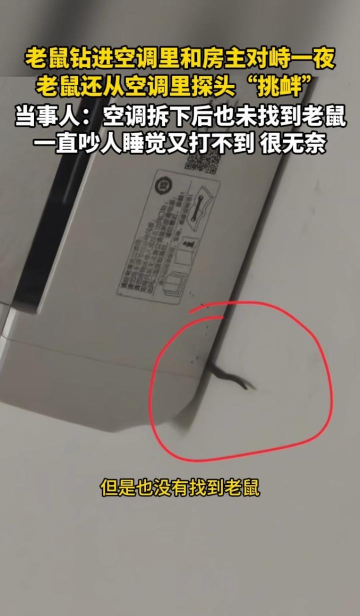 近日四川成都,一35岁女子晚上睡觉,却总是听到空调里有声音,吵的她睡不着觉,靠近一看直接傻眼了! 女子靠近空调一看,发现一只老鼠在空调上,露着头看着她,仿佛在挑衅女子:你有本事上来抓我呀!女子和老鼠对峙了一晚上,双方难分出胜负!气的女子叫老公直接把空调拆了下来,结果还是没找到那只老鼠!等女子准备去睡觉,空调里又继续发出啄木鸟啄树的声音!女子真的被这只老鼠给折磨惨了!大家有什么方法可以帮帮她?