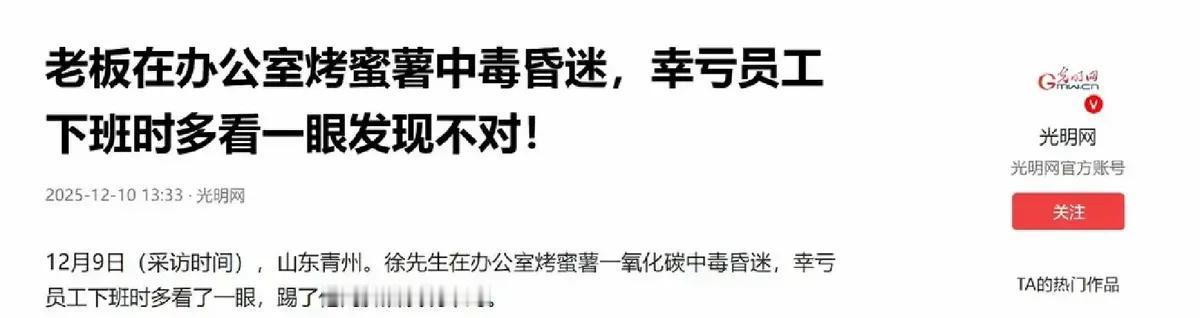 青州一老板下班不走,关着门在办公室拿小炭炉烤蜜薯,想边加班边闻甜味儿。 炭火闷了半小时,屋里一氧化碳爆表,人直接晕地上。 老员工收拾包准备回家,看老板灯亮却敲不开门,趴门缝闻到烟味,踹门拖人打120,硬是把命抢回来。 老板吸氧两天出院,第一句话就是“再也不嘴馋”,当场给救命老哥发奖金,还下令全公司禁明火。 我刷到这条,脑子里全是烤红薯的香味配着警报声,香是真香,命也是真悬。 打工人心眼好,老板命大,冬天再馋也得上通风的地儿吃烤蜜薯,命只有一条,别拿炭火开玩笑。