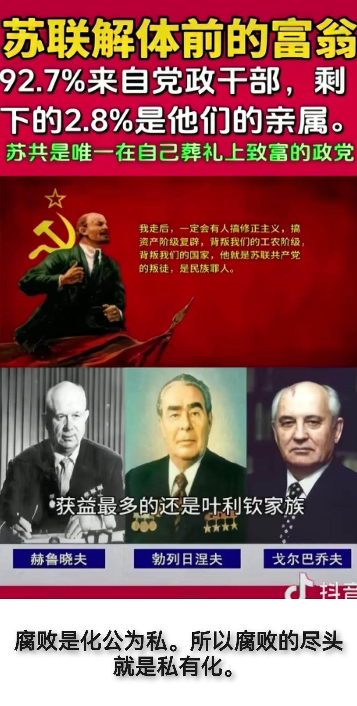 苏联为什么走资派能复辟资本主义? ------------------------------------ 走资派复辟的第一步就是论证:自私是永恒不变的人性。 在一个自私为正确的舆论大环境下,腐败实际上是合乎道德的——大家都自私,换谁都一样。 腐败就是化公为私。腐败的尽头就是私有化。 复辟成功。