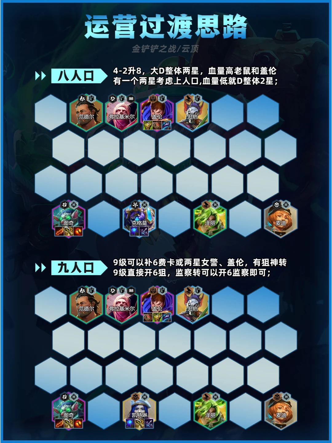 后期变阵:9级补任意2星盖伦或女警,其次补任意6费卡