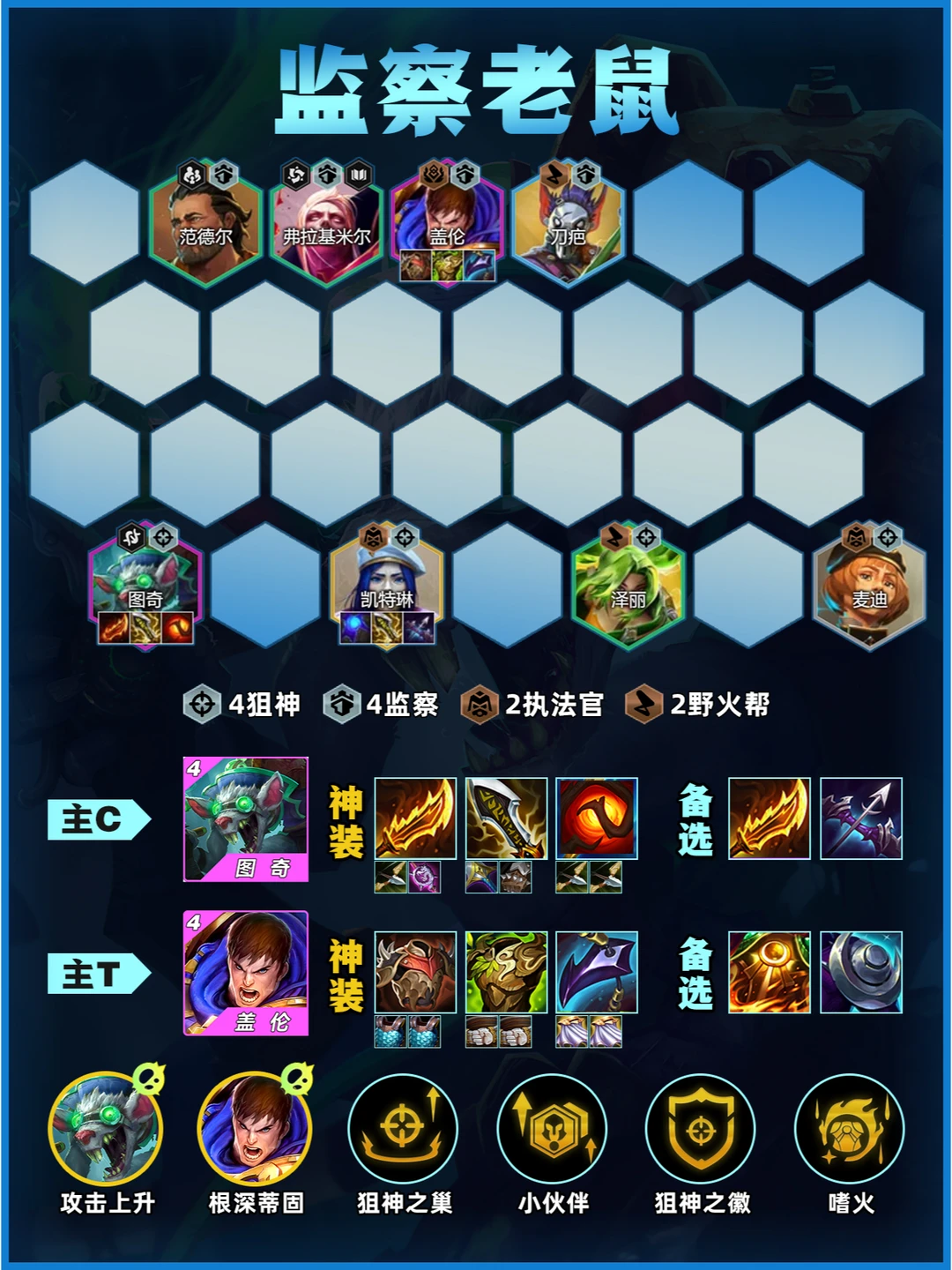 羁绊:4狙神 + 4监察 + 2执法官 + 2野火帮