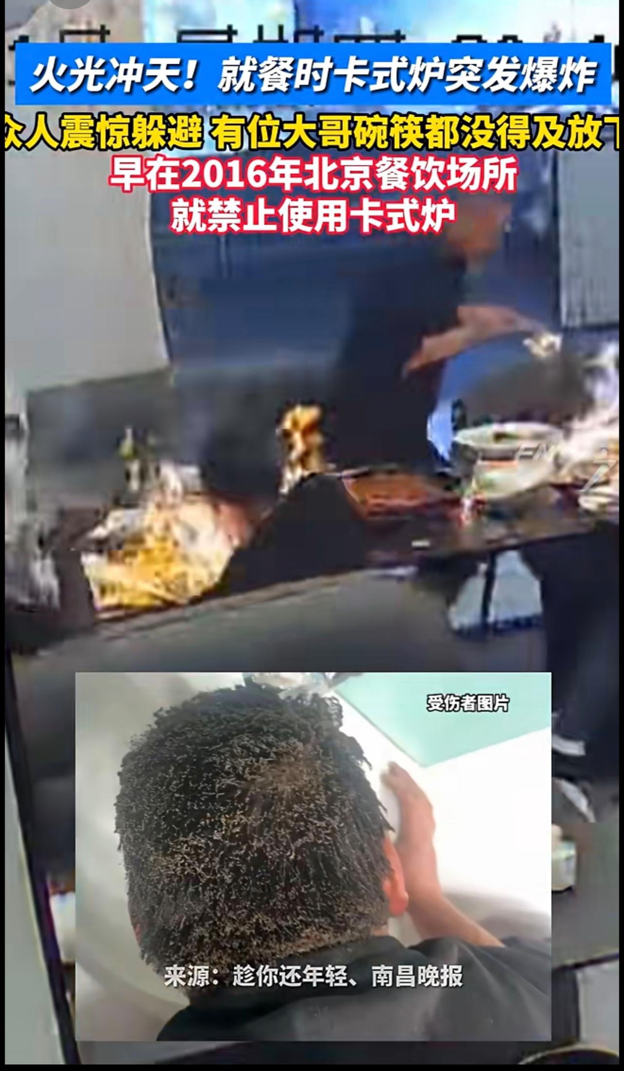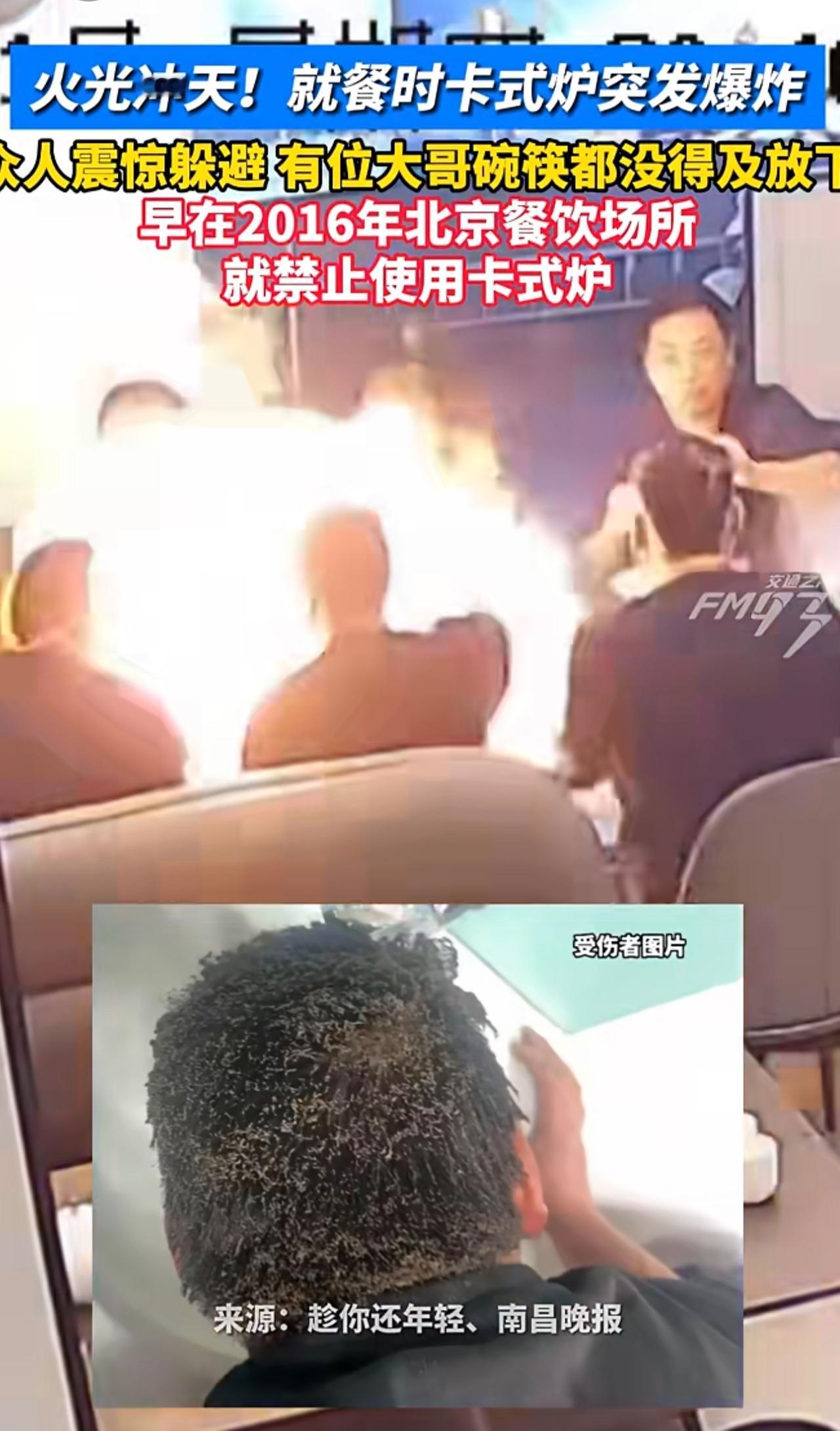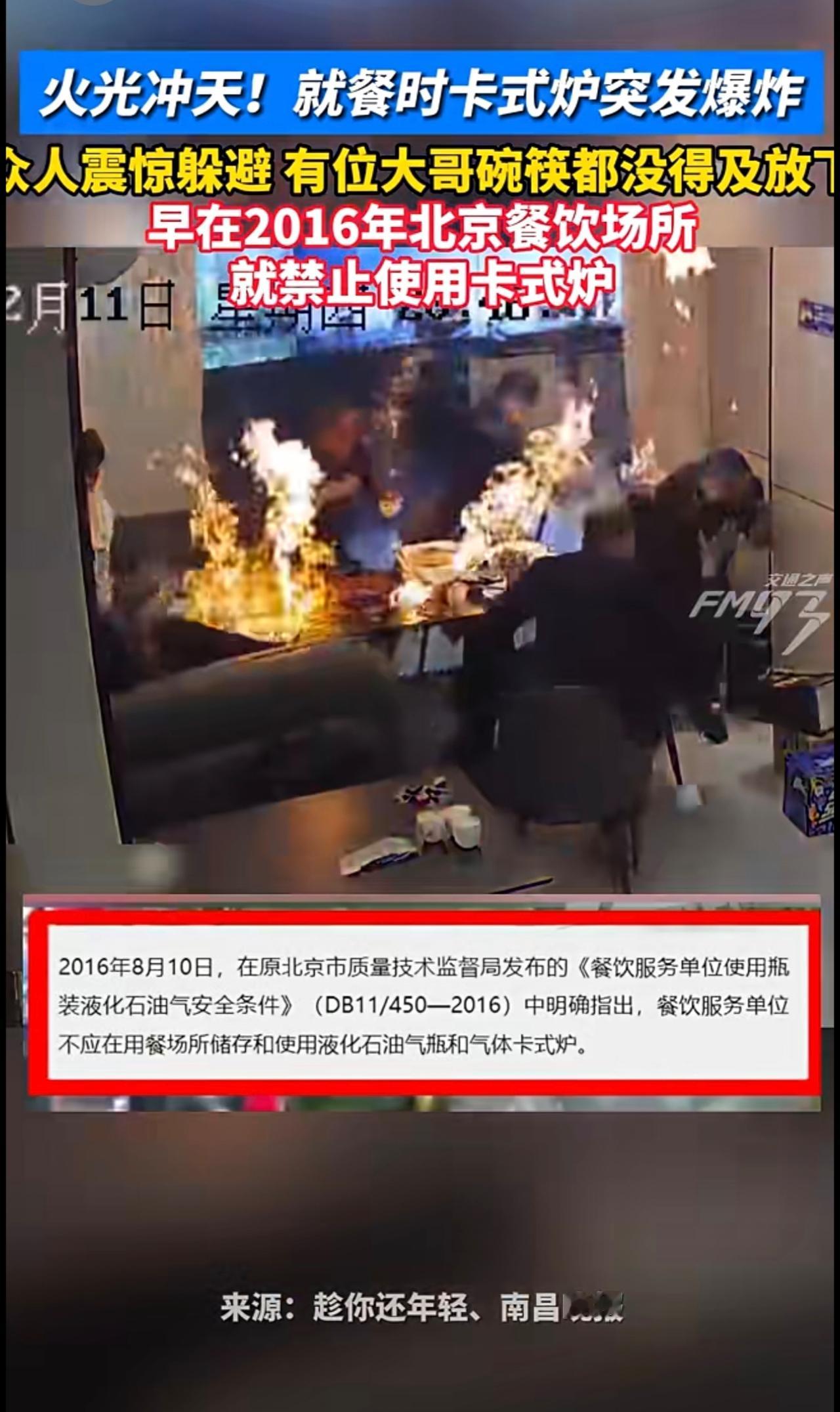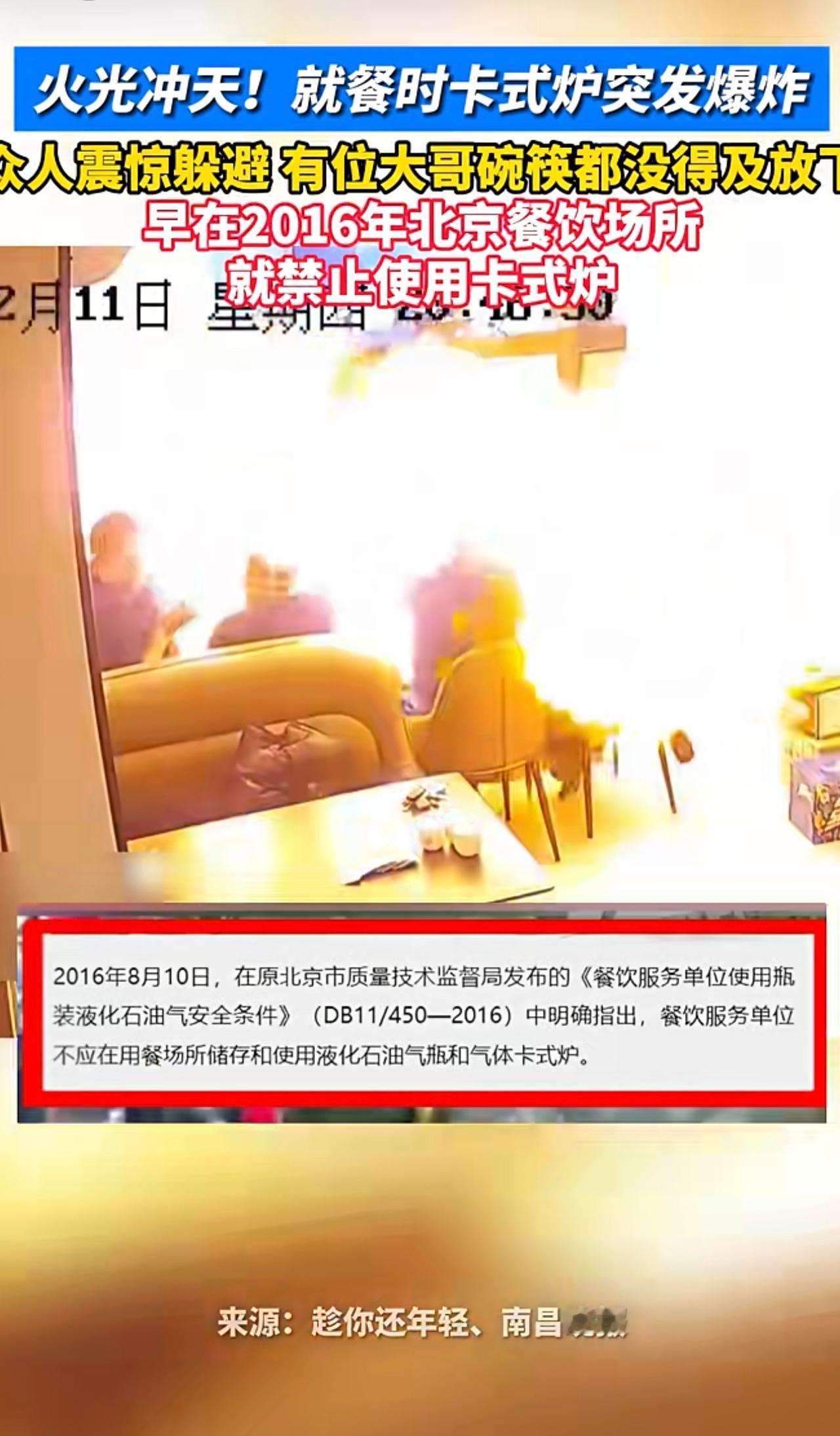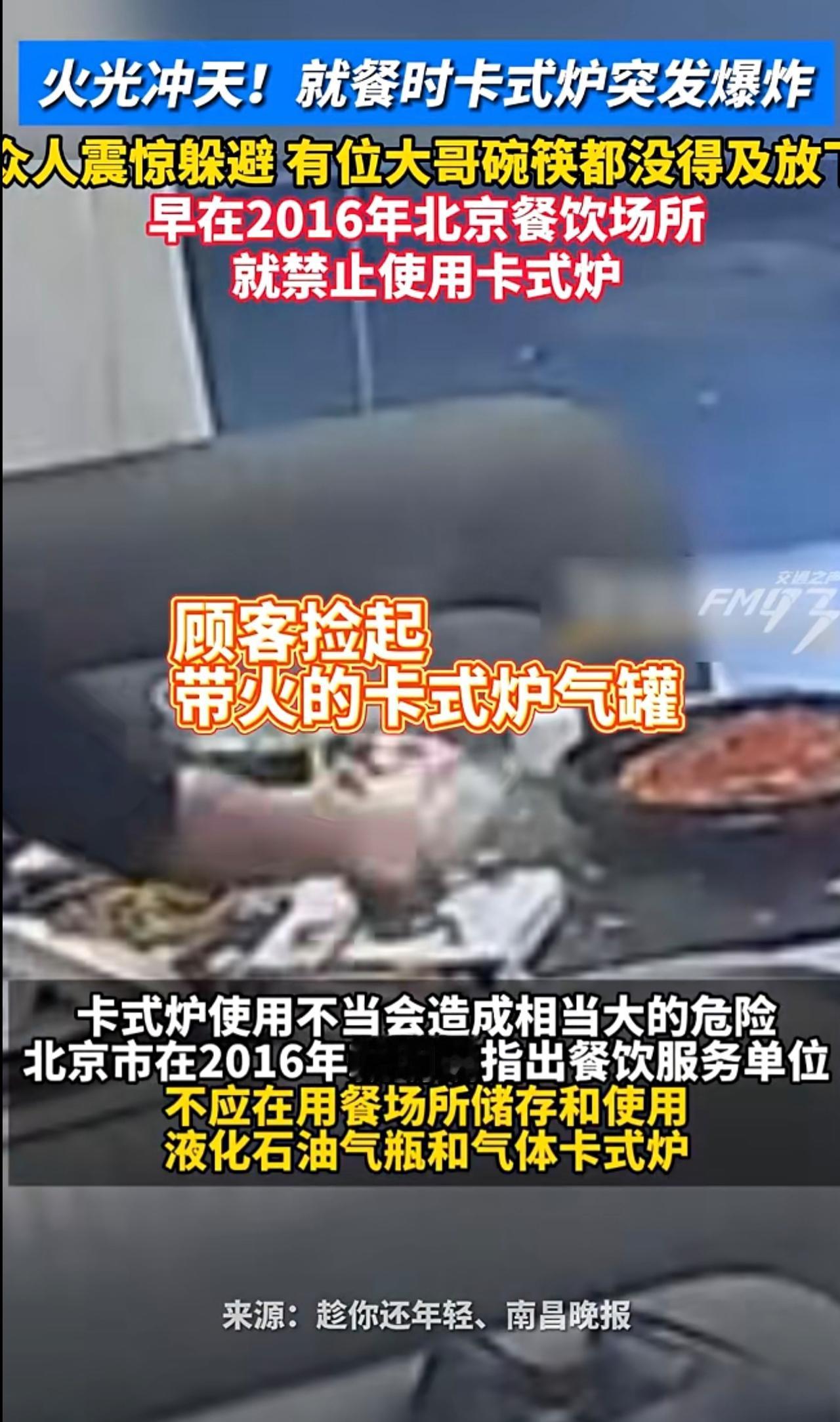 火光冲天!北京一餐馆就餐时卡式炉突发爆炸,众人震惊躲避,有位大哥碗筷都没得及放下。早在2016年北京餐饮场所,就禁止使用卡式炉。