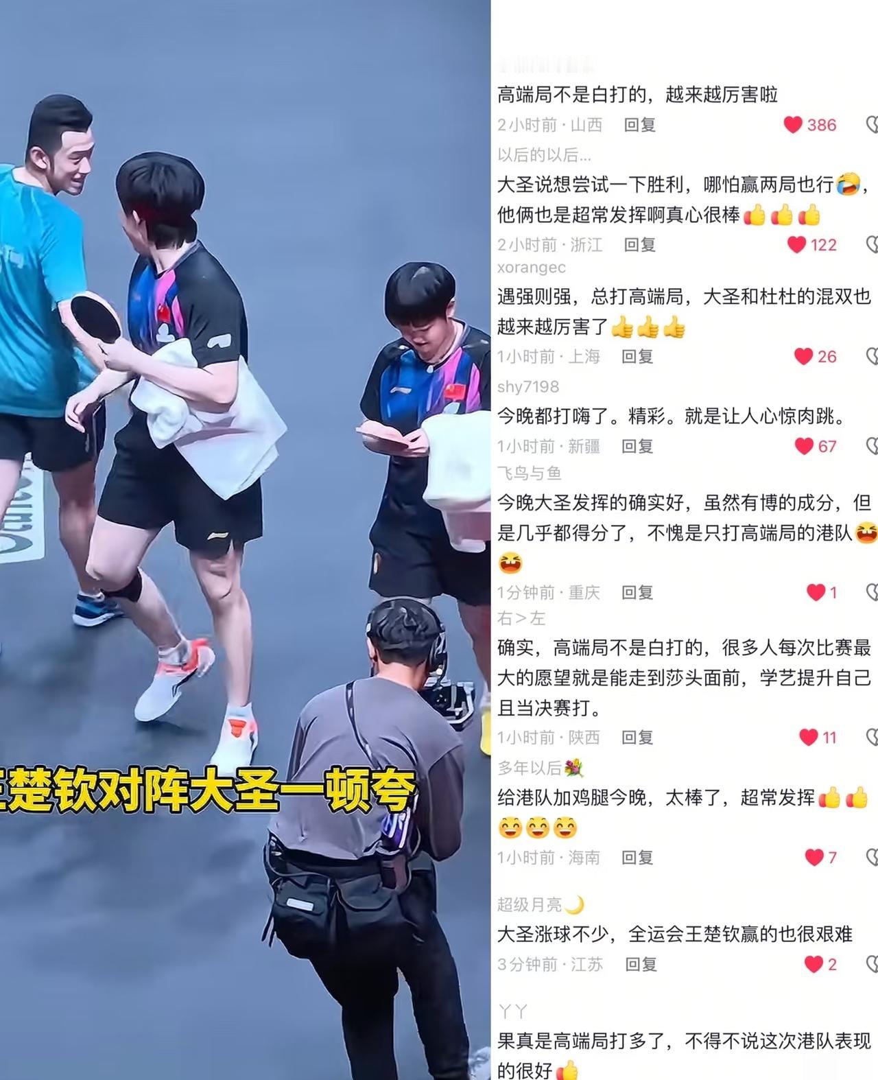 厉害! 大头对港队的陈大圣一顿夸。 混双,莎头对想港队,没想到,四人都很厉害,那真是高端局。解说员都说四人打出了很多双打当中的极限跑位,大开眼界。 真牛! 这一场比赛,混双老祖莎头吃了个全场只拿1分的局面,也许是战术也许是控球,总之想港队是真厉害。大头对陈大圣夸赞不已。 网友也忍不住不夸赞,这真是高端局,越来越厉害。