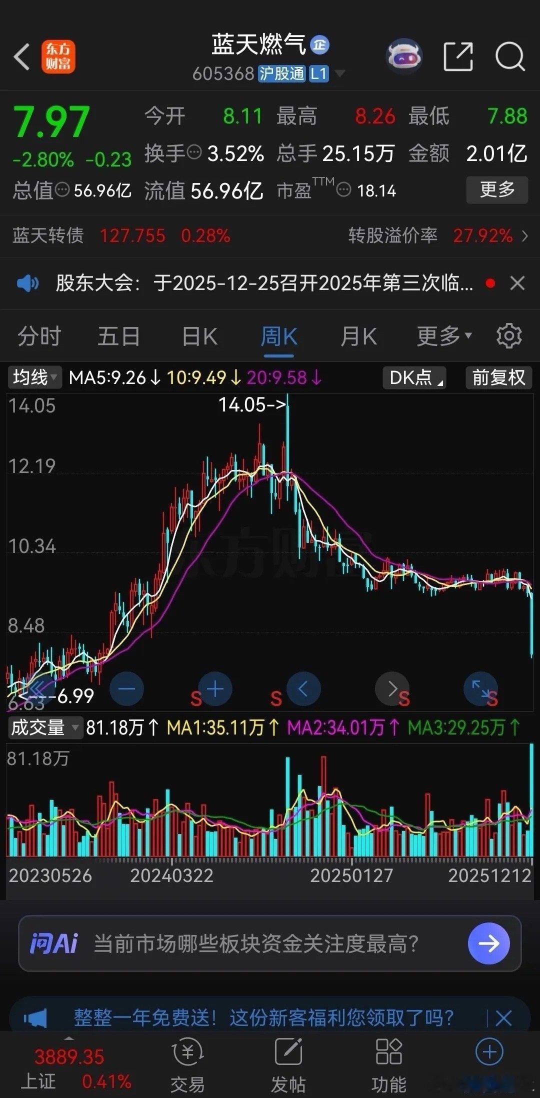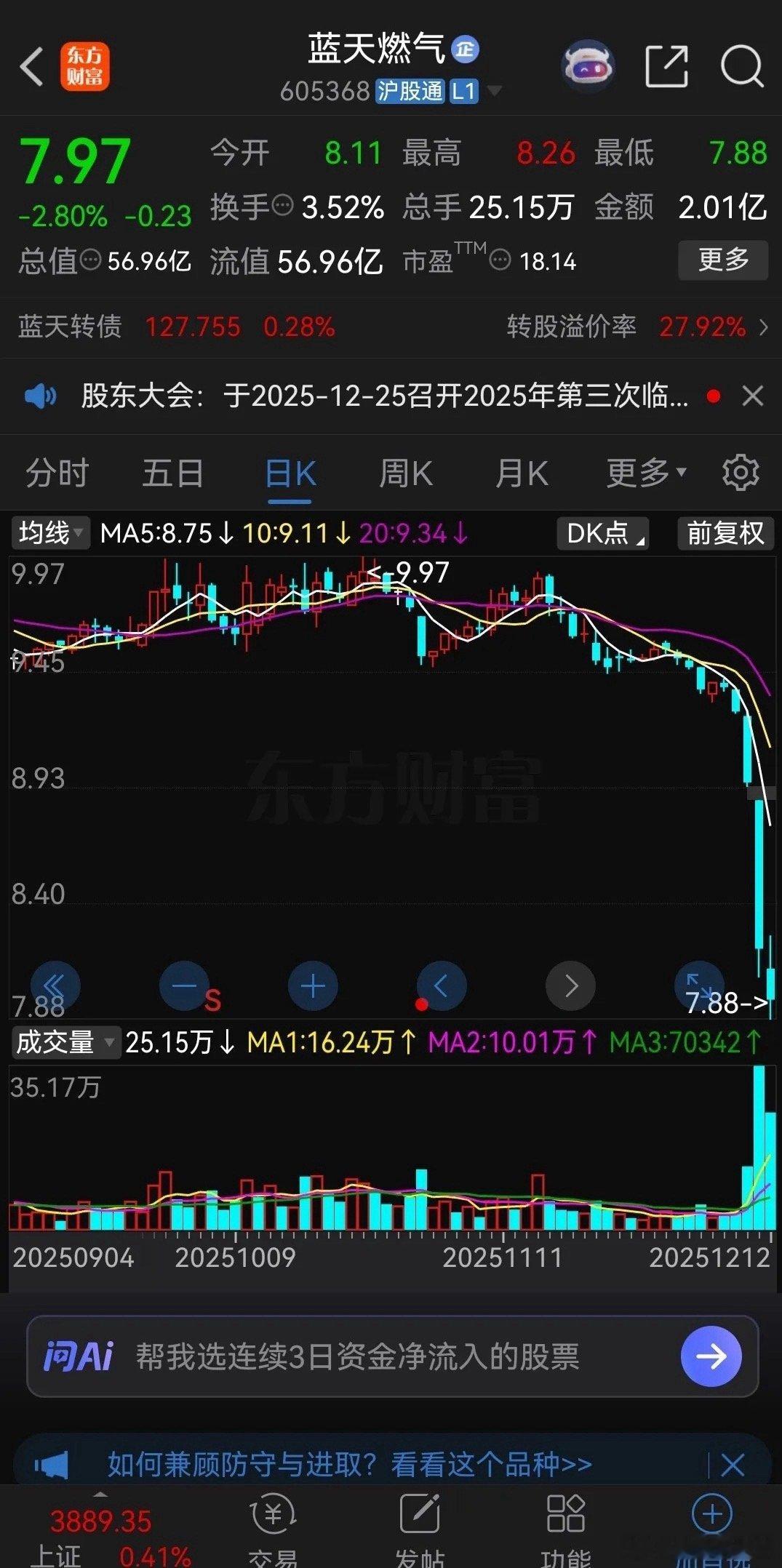 太狠了!连续崩盘式下跌!蓝天燃气连续5天下跌,连续3天大跌,周三大跌3.45%,周四大跌8.38%,今天跌破8元关口,盘中最低跌到了7.88元,一度跌幅近4%。对于一只股息率超过10%的蓝筹股,这种走势是非常罕见的。今天这一跌,股价创出了近两年以来的新低,资金都快跑光了,这两年奔着股息进来的股民全被“埋”在土里了!