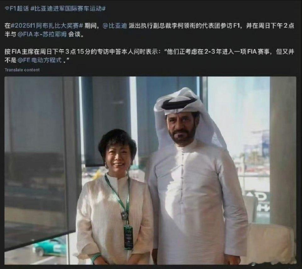 Fia主席本·苏拉耶姆:比亚迪正在考虑进入2-3项FIA(国际汽车联合会)的赛事,但不是F1方程式。目前FIA共有四大赛事项目:F1方程式,WRC世界汽车拉力锦标赛,GT大奖赛,WTCC房车锦标赛。以比亚迪目前的汽车技术,进入F1方程式也不是不行,但F1太烧钱了,感觉没有必要,参加其他赛事就行。
