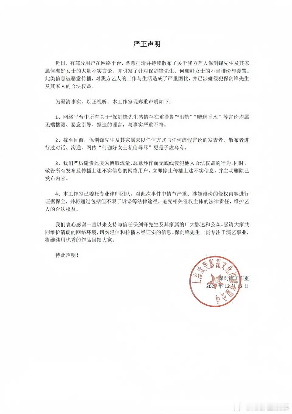 保剑锋方回应今晚,发布声明,回应黄慧颐暗指其出轨并把自己的香水送给别人一事,称所有关于“保剑锋感情存在重叠期”“出轨”“赠送香水”等言论均为捏造的谣言,与事实不符。保剑锋及其家属未与虚假言论发表者发表者、散布者进行过沟通,网传“何珈好私信辱骂”更是子虚乌有。