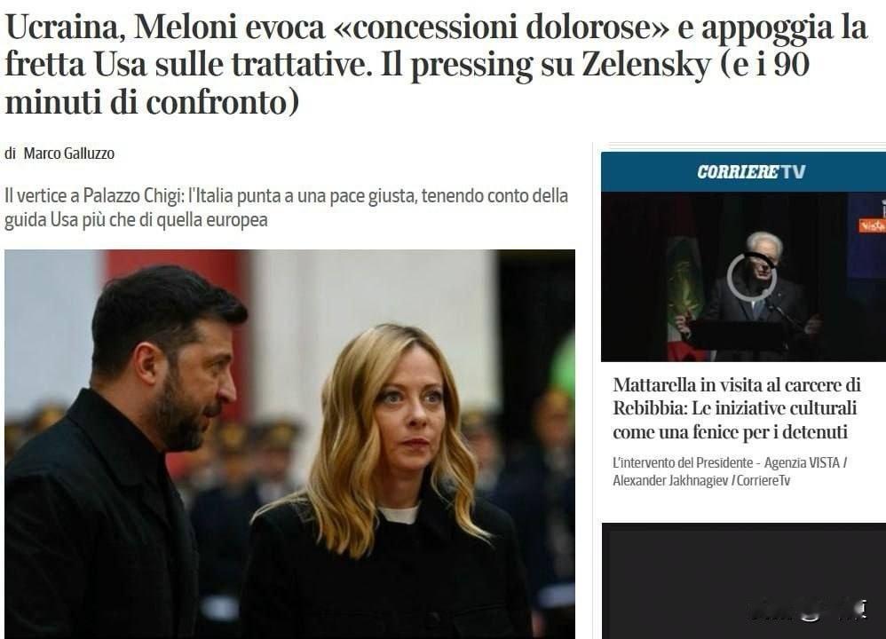 据外媒报道,意大利总理梅洛尼花了90分钟试图说服泽连斯基做出「痛苦的让步」以结束战争,但被泽连斯基拒绝了。没想到,泽连斯基反过来试图说服梅洛尼帮他劝一劝特朗普。