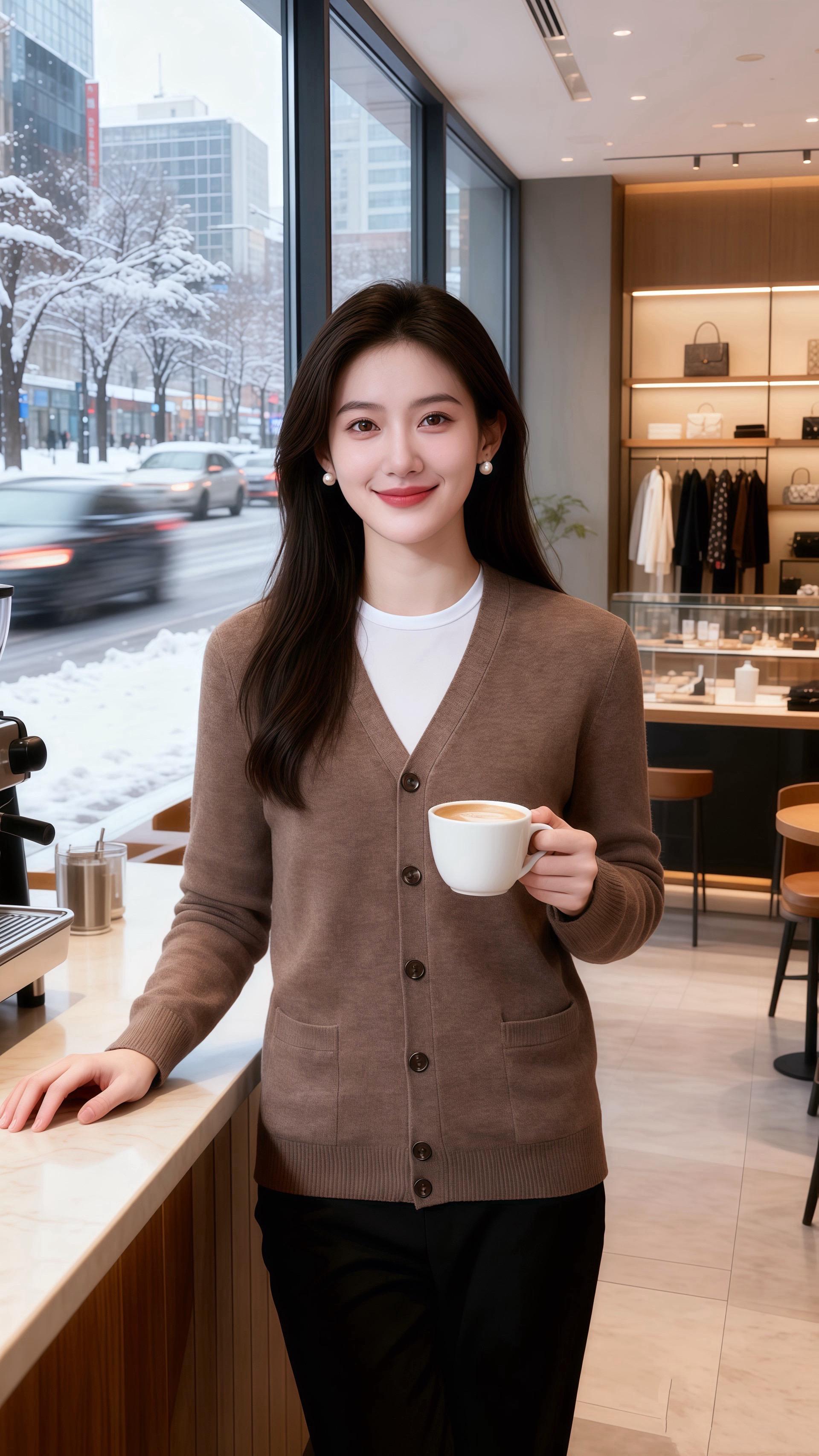 她穿咖色V领针织开衫,柔糯的面料贴合身形,单排纽扣顺着衣身排列,简约中藏着慵懒的温柔。内搭白色圆领打底衫,干净的白与醇厚的咖相撞,衬得肤色愈发温润。下配黑色长裤,裤型挺括却不生硬,和开衫的软糯形成巧妙对比,整身穿搭像冬日里的焦糖布丁,甜润的咖糅合着白的清爽,连桌旁的花束都成了灵动的点缀。
