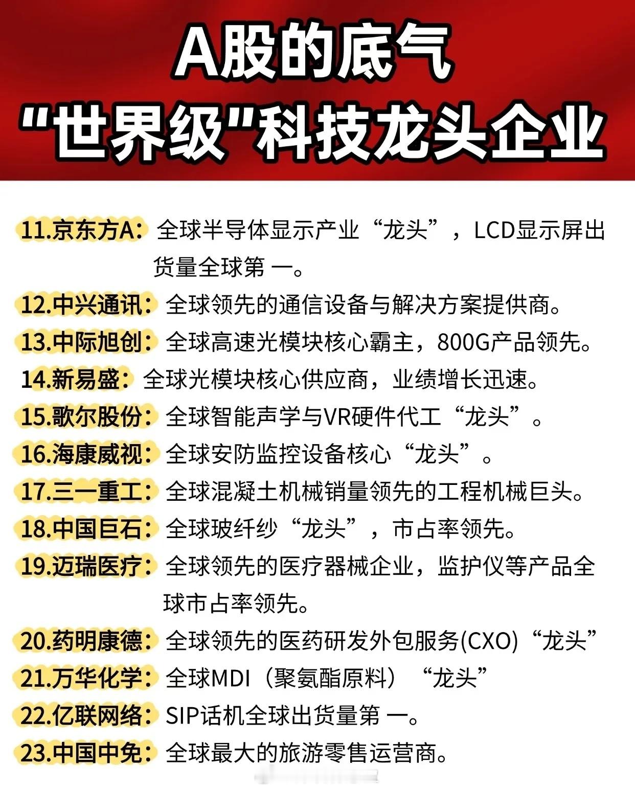 围绕“A股的底气‘世界级’科技龙头企业”主题,分别列举了不同领域的代表性A股上市企业及其核心优势与市场地位。第一张图展示了前10家企业:工业富联作为全球数字经济与智能制造领军企业、AI服务器核心供应商;中芯国际是中国大陆技术最先进、规模最大的晶圆代工企业;澜起科技稳居全球内存接口芯片龙头且技术领先;韦尔股份旗下豪威科技是全球领先的CMOS图像传感器供应商;长电科技位列全球第三、国内第一的半导体封测龙头;宁德时代连续八年保持全球动力电池装机量第一;比亚迪是全球新能源汽车销量冠军并具备垂直整合产业链优势;隆基绿能是全球最大单晶光伏制造商;阳光电源领跑全球光伏逆变器市场;立讯精密在消费电子精密制造领域称雄,也是苹果产业链核心供应商。第二张图补充了第11至23家企业:京东方A为全球半导体显示产业龙头,LCD显示屏出货量世界第一;中兴通讯是全球领先的通信设备与解决方案提供商;中际旭创在高速光模块领域占据核心地位,800G产品领先;新易盛是全球光模块重要供应商且业绩快速增长;歌尔股份是智能声学与VR硬件代工龙头;海康威视在全球安防监控设备领域居核心位置;三一重工是混凝土机械销量领先的工程机械巨头;中国巨石为全球玻纤纱龙头,市场占有率领先;迈瑞医疗在医疗器械领域全球领先,监护仪等产品市占率居前;药明康德是全球医药研发外包服务(CXO)龙头;万华化学掌握全球MDI(聚氨酯原料)龙头地位;亿联网络的SIP话机全球出货量第一;中国中免则是全球最大旅游零售运营商。整体来看,这些企业覆盖数字经济、半导体、新能源、光伏、通信、高端制造、医疗器械、化工、消费电子等多个关键领域,体现了A股市场中一批在全球范围内具备显著竞争力和领先地位的科技与产业龙头,构成了“A股底气”的重要支撑。