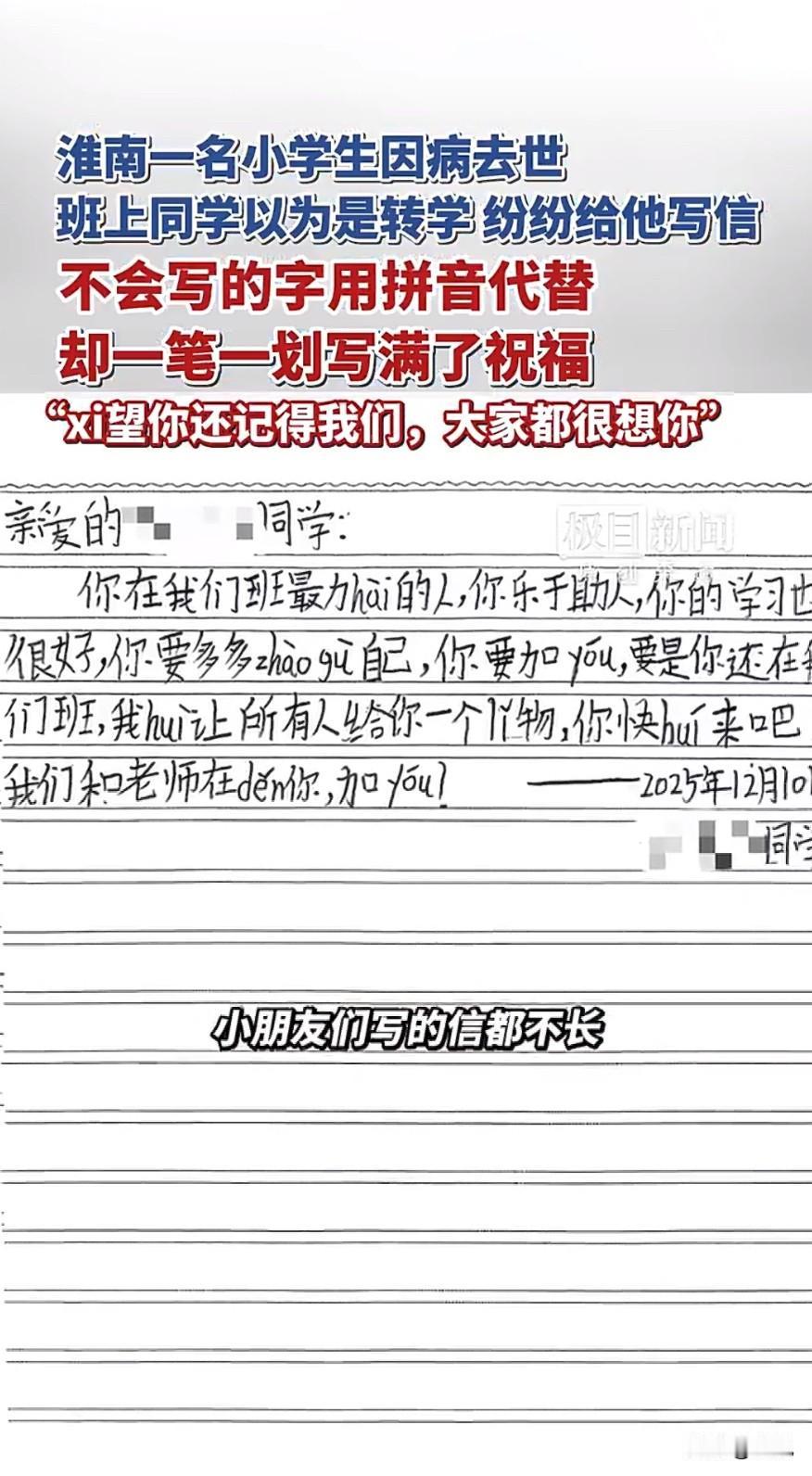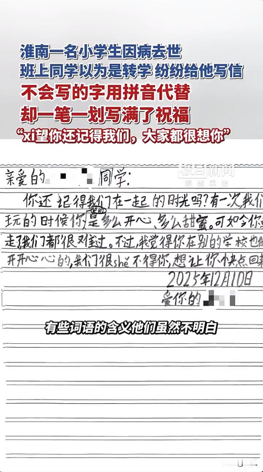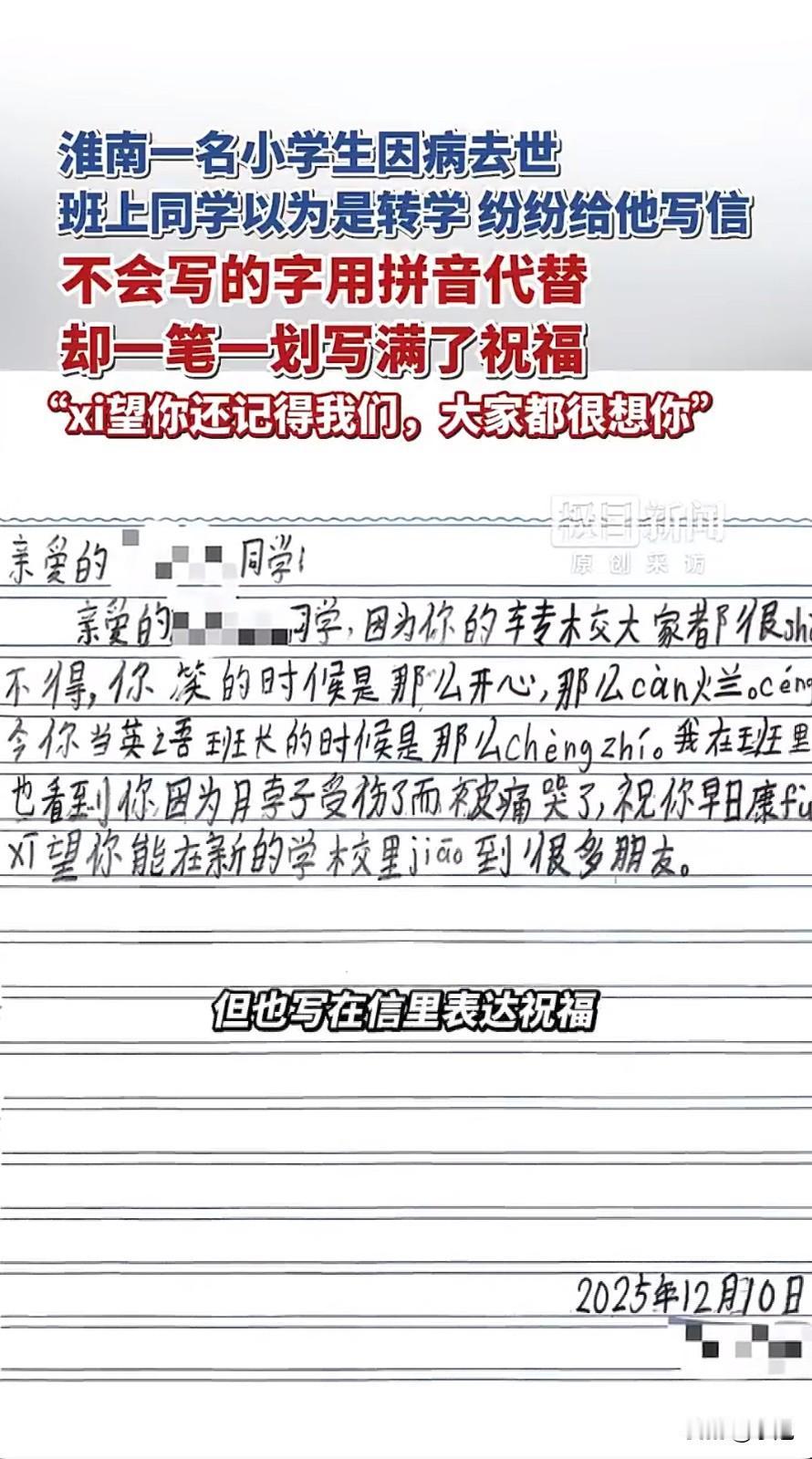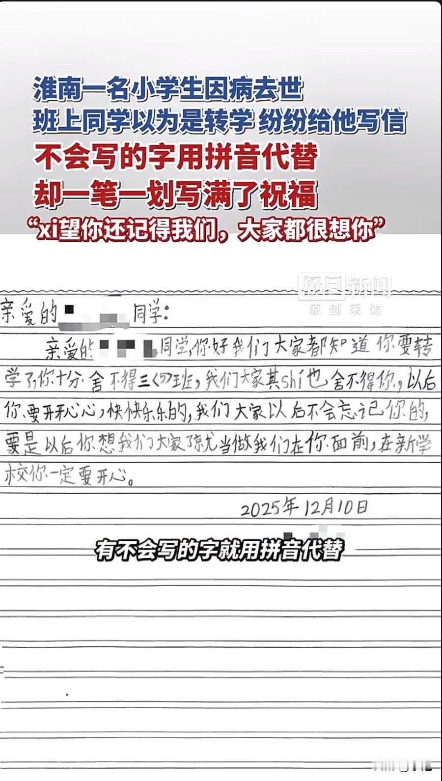 三年级男孩因病去世了。但星期一的语文课上,班主任红着眼睛,却对全班孩子说:“他转学了,去很远的地方养病。” 说完这句话,她停顿了很久,手扶着讲台才站稳。就在刚刚过去的周末,这个她教了两年的孩子,在从上海回家的私家车里,永远闭上了眼睛。消息传来时,她在办公室哭到不能自已。 可现在,她面对着四十多双干净的眼睛,那些眼睛里盛满了疑问和天真。她深吸一口气,把“去世”这两个字,死死地咽回了肚子里。 她太清楚了。一旦说出来,教室里瞬间的寂静之后,将是此起彼伏的、带着恐惧的哭声。这些七八岁的孩子,会第一次真切地触摸到“死亡”的冰冷和不可挽回。从此,那个空座位会成为他们童年的一个黑洞,生病、医院、甚至短暂的分别,都可能成为新的噩梦。 她不能这么做。 于是,她选择了一个听起来只是有点难过的故事——转学。 “他走得急,特别舍不得大家。”老师的声音努力维持着平稳,“我们一起给他写封信吧,把想说的话都写下来,老师……老师会转交给他的。” 孩子们信了。他们纷纷低下头,拿出花花绿绿的信纸。 一个女孩认真地写着:“到了新学校,你一定要把这封信带着。如果想我们了,就看看信,希望能暖心。” 一个平时总和他追跑打闹的男孩,写得特别慢,最后一个交上来。他蹭到老师身边,声音已经带了哽咽:“老师,你告诉他……我特别想他。我希望他能回来。” 还有一个孩子,悄悄把几块崭新的、水果形状的橡皮放在讲台角落,小声说:“老师,这个送给他,希望他早点好起来。” 紧接着,更多的“宝贝”被放在了讲台上:一个男孩最得意的“宝剑”橡皮,一个女孩珍藏的亮闪闪的卡片。 班主任默默收好所有的信和礼物,然后整理男孩抽屉里留下的课本、作业本。她把所有东西,整整齐齐地放进一个干净的纸箱。最后,她将一整卷还没用完的小红花贴纸,轻轻放在了最上面。以前课堂表扬时,他总因为积极举手,得到最多。 胶带封上纸箱的声音,在安静的教室里显得有点响。 网上很多人说,被这些用拼音写成的信弄哭了。也有人说,孩子应该学会面对真实。 但如果你在那一刻,站在那个讲台上,你就会懂。那不是一个需要理论来评判的“教育情境”,那是一个心碎的大人,在暴风雪来临前,用身体为身后一群毫无准备的孩子,筑起的第一道也是唯一一道挡风墙。 她用“转学”这个听起来尚可承受的理由,接住了孩子们世界最初的那阵剧烈晃动。悲伤被引导成了绵长的思念,恐惧被暂时隔离在了童年之外。 那个纸箱里,封存的不仅仅是一个孩子的痕迹。那里有被小心翼翼保护起来的童真,有未经污染的同窗情谊,还有一位老师,在自身巨大的悲痛中,依然选择伸出手,为她的学生们,撑起的一片暂时晴朗的天空。