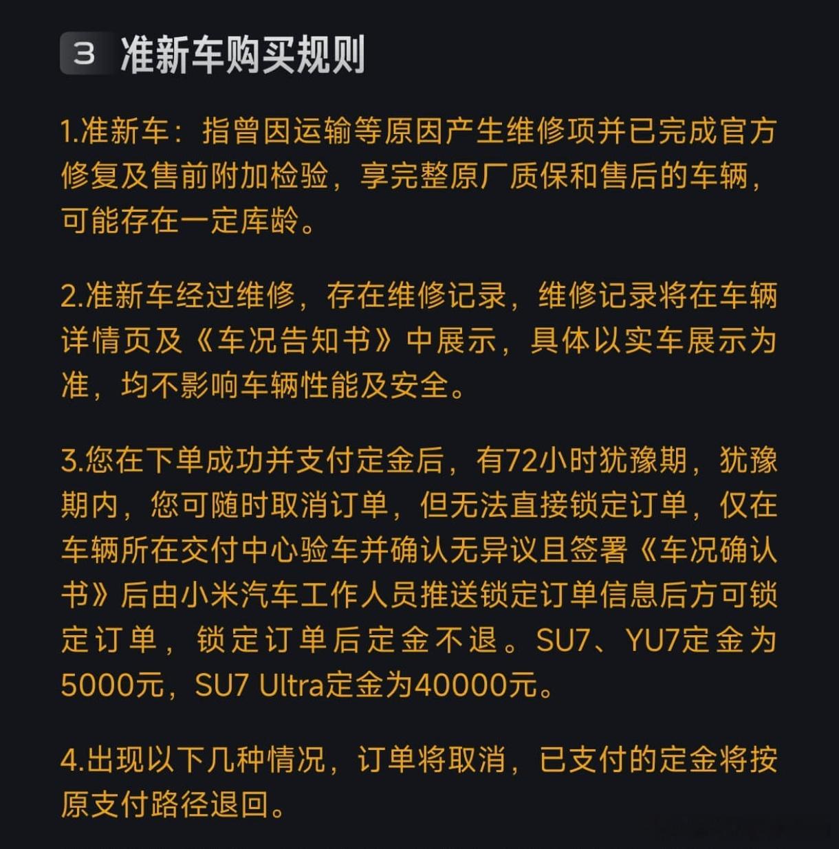 雷军回应小米准新车命名争议【结论】小米销售的准新车确实定义不准确,应该叫新车。【准新车】并没有行业标准的定义,但是有一定的共识【公里数很少车况几乎等同于新车的二手车】注意,是二手车【运损车】运输中受损,经官方修复后销售,未登记上牌。属于新车! 两者最大的区别是【准新车是二手车,运损车是新车】