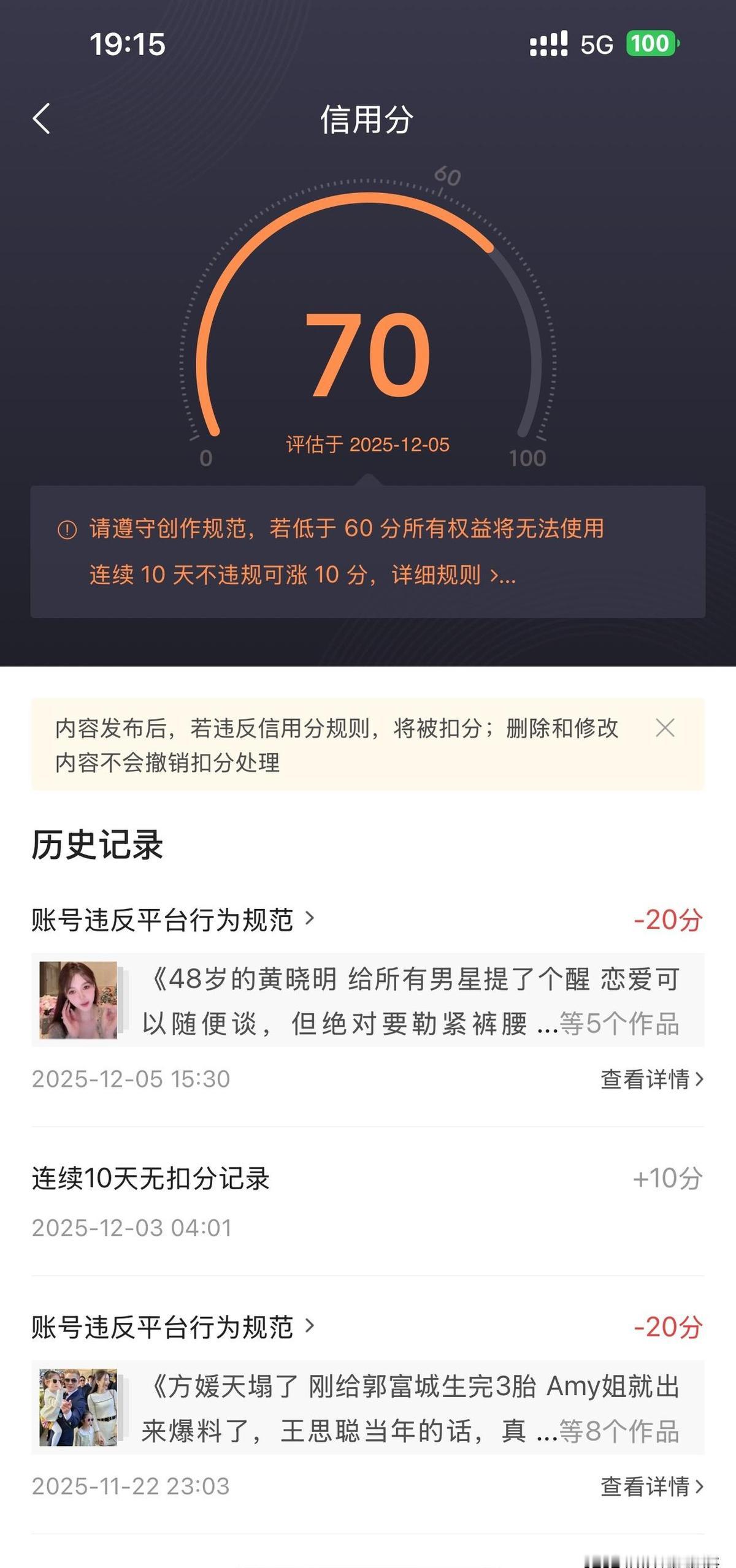 辛苦码字攒的信用分掉到70,不仅提现时看着扣税肉疼,心心念念的“50万阅读奖500”也可能是个大坑! 这年头做号,不搞懂规则简直就是给平台打白工,咱们今天必须把这笔糊涂账算清楚。 先说那个让很多人睡不着觉的“扣税”问题,别一看到钱少了就觉得是信用分低的锅。 其实只要单次提现超过800,平台按规矩都要预扣税,这跟你是100分还是70分没半毛钱关系,年底个税APP上还能申请退呢。 但70分这个尴尬分数,确实是“紧箍咒”,现在的“新锐创作者”门槛早就卷起来了,没个80分打底,再加上持续的原创输出,根本挤不进那个权益圈子,只能眼巴巴看着别人拿流量扶持。 至于那个“50万阅读=500块”的传说,听听就算了,千万别当真理信。 我看过圈里太多例子,有些泛娱乐的水文,几十万阅读可能就换个几块钱买菜钱,单价低到尘埃里;反倒是那些垂直领域的,几万阅读就能拿这个数。 现在的算法精着呢,它看的是粉丝粘性和停留时长,光凑点击量没用。 那30天恢复期虽然难熬,但也别干等着,老老实实每天更一两篇合规的,别再碰红线,这分养养就回来了。 你现在的信用分还在安全区吗? 还是哪次“手滑”踩了雷? 评论区透个底,咱们互相帮衬着避避坑!
