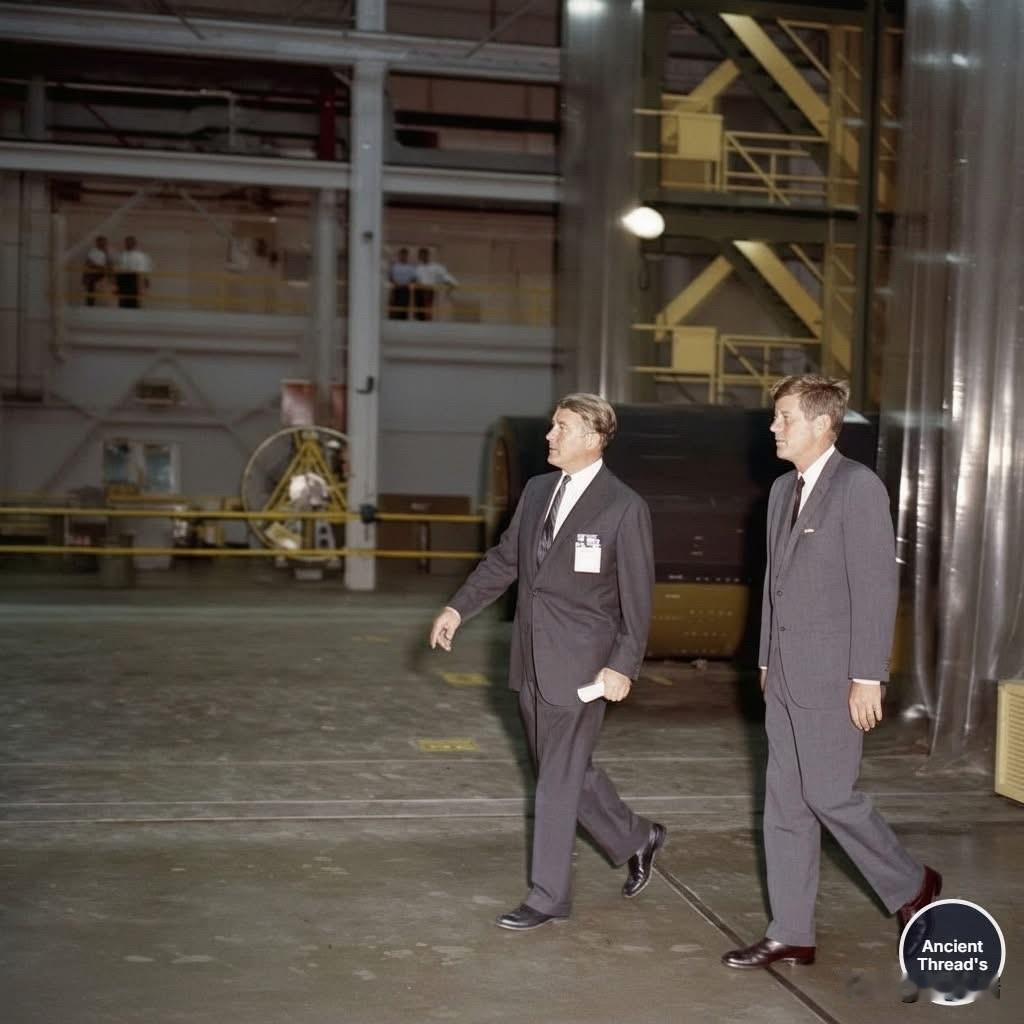 这张照片拍摄的是 约翰·F·肯尼迪 (John F. Kennedy) 总统在 沃纳·冯·布劳恩(Wernher von Braun )的陪同下参观 NASA 马歇尔太空飞行中心 (Marshall Space Flight Center)。这张历史照片拍摄于1962年9月11日。 照片中穿灰色西装的是美国总统约翰·F·肯尼迪;旁边穿深色西装并带领参观的是火箭科学家 沃纳·冯·布劳恩(Wernher von Braun )博士,他当时是马歇尔太空飞行中心的负责人。 地点: 参观地点是位于阿拉巴马州亨茨维尔的 NASA 马歇尔太空飞行中心。 活动: 肯尼迪总统此行是为了亲自了解他于1961年提出的“阿波罗计划”(载人登月目标)的进展。在这次访问中,他视察了土星一号运载火箭(Saturn I rocket),这是当时世界上最强大的火箭,也是后来用于登月的土星五号(Saturn V)火箭的前身。 这次访问是肯尼迪总统1962年9月太空设施巡回访问的一部分。在这次巡访期间,他还在休斯顿莱斯大学发表了著名的“我们选择登月”演讲,重申了美国在太空竞赛中取得领先地位的承诺。