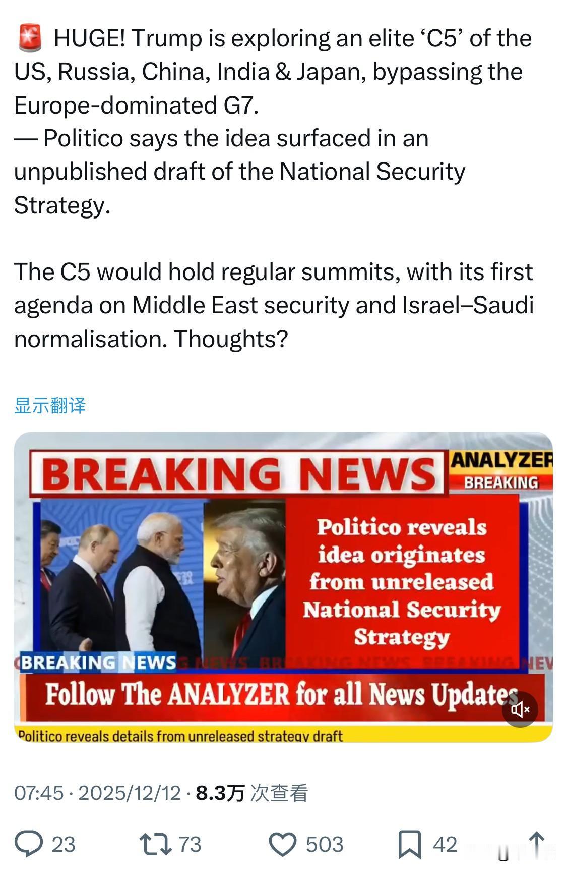 重大消息!特朗普正在探索建立一个由美国、俄罗斯、中国、印度和日本组成的精英“C5”集团,绕过以欧洲为主导的G7集团。 据 Politico 报道,这一想法出现在一份未公开的国家安全战略草案中。 C5集团将定期举行峰会,首轮议程将聚焦中东安全和以沙关系正常化。