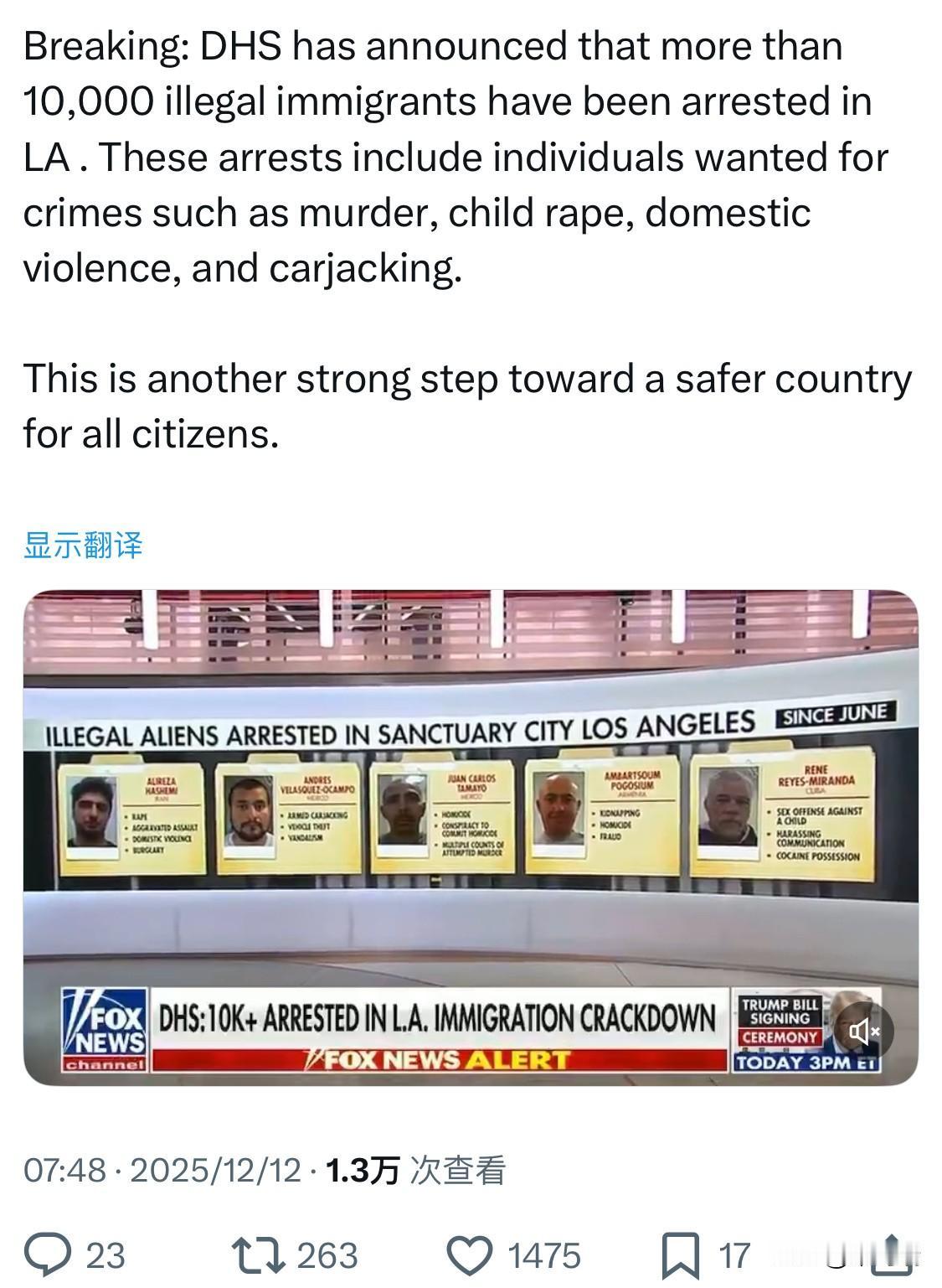 福克斯突发新闻:美国国土安全部宣布,洛杉矶已逮捕超过1万名非法移民。被捕人员包括因谋杀、强奸儿童、家庭暴力和劫车等罪行而被通缉的嫌疑人。