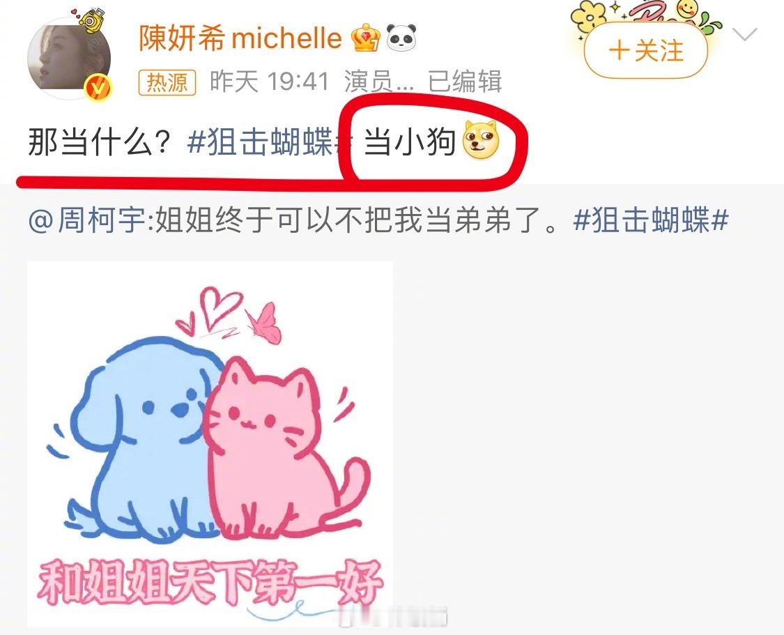 剧版狙击蝴蝶陈妍希说把周柯宇当小狗 《狙击蝴蝶》戏外有自己的小狗连续剧 刘芮麟也在嗑陈妍希周柯宇