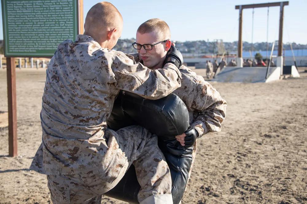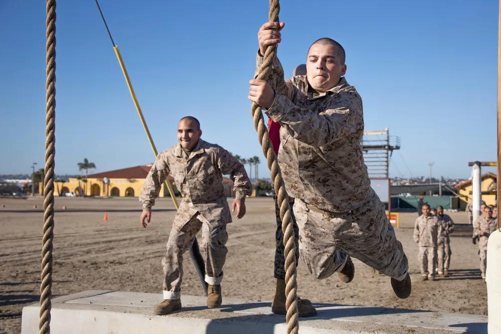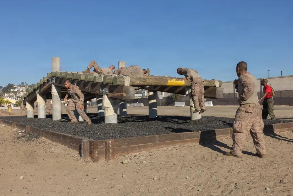 美国海军陆战队新兵训练也不过如此,中国新兵训练也不比他差。 2025年12月8日,美国海军陆战队一训练营第一新兵营布拉沃连的新兵,加利福尼亚州圣地亚哥海军陆战队新兵训练营参加信心课程活动。信心课程在心理、身体和精神上考验新兵,让他们面对需要力量、平衡和决心的障碍。