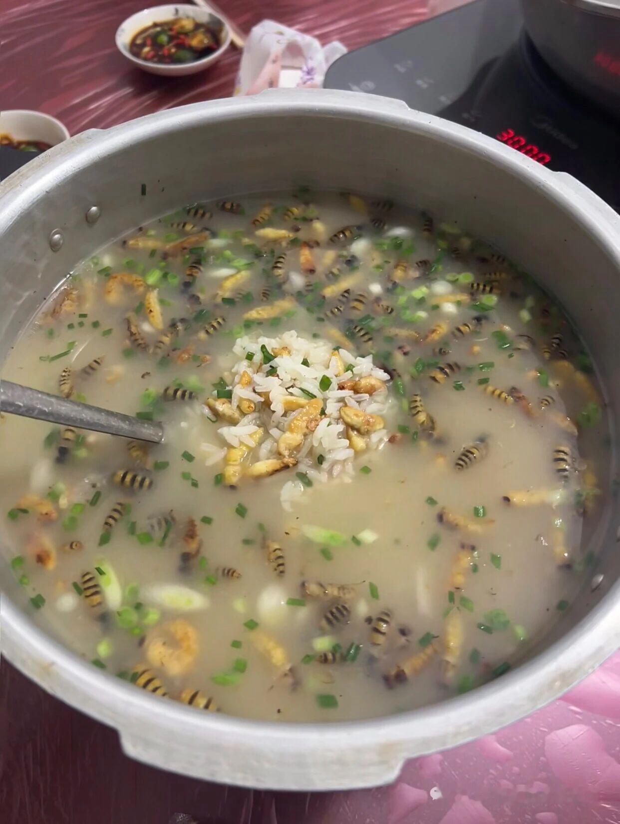 好歹毒的粥,第一次去广东朋友家,就熬这粥招待我?人间美味之———蜂蛹粥,蛋白质满