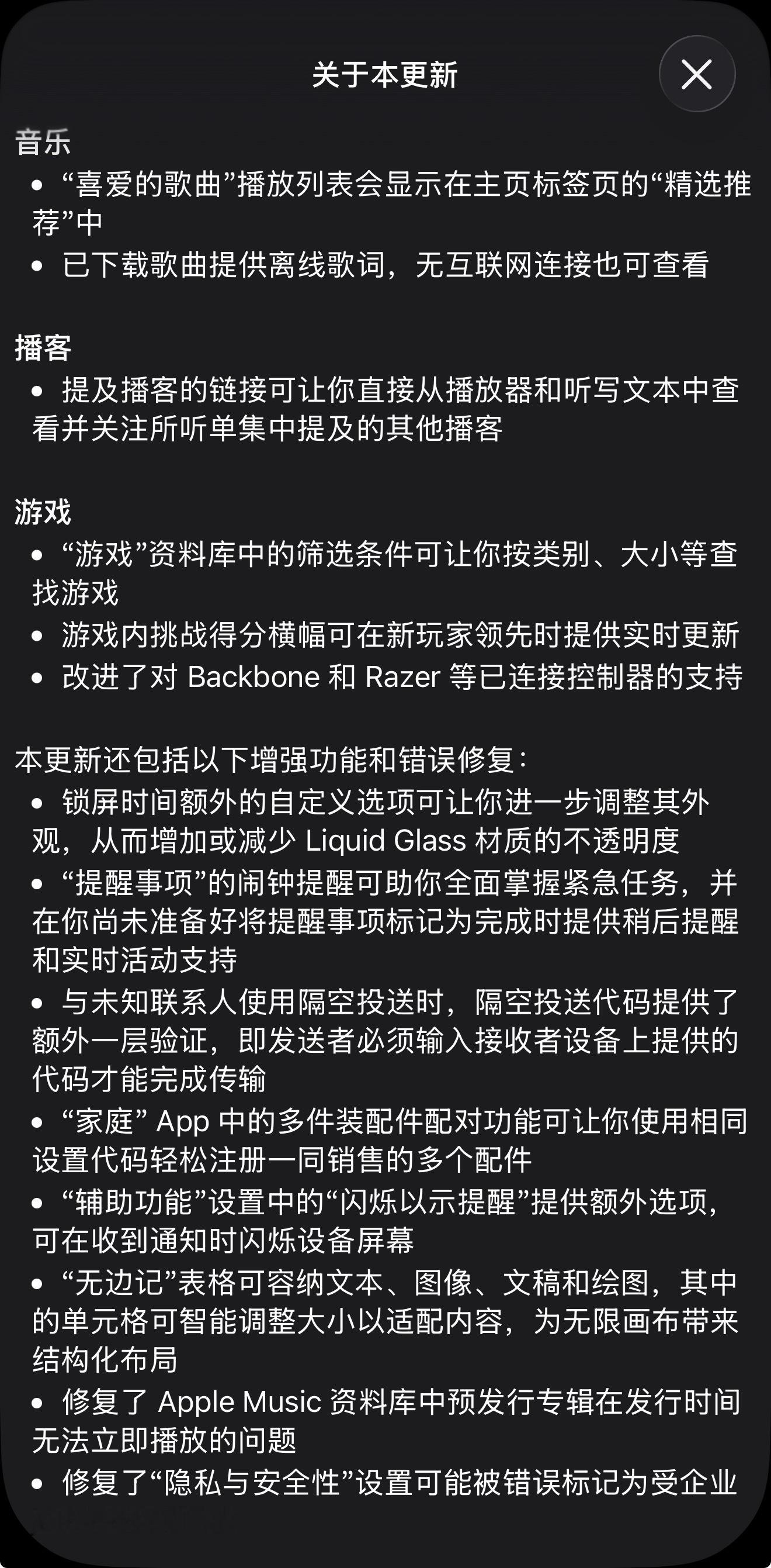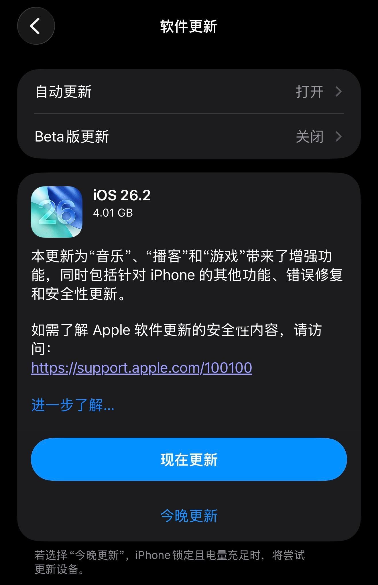 苹果现在更新频率是个迷,原来基本在每周二凌晨会收到更新,大周末的更新应该是这么多年头一次。今儿凌晨苹果推送了 iOS 26.2 正式版,没啥特别的玩意,更新包 4G,画了一年多的大饼的 Apple Intelligence 还没来…… 甚至我觉得在 iPhone 17 系列生命周期都等不到了。