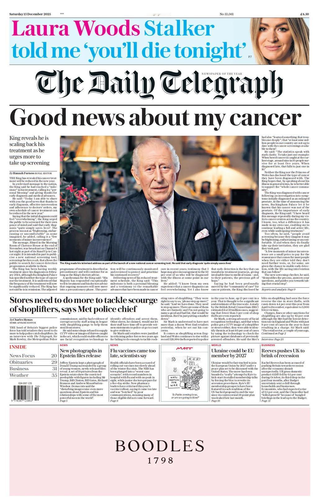 《每日电讯报》写道,英国国王表示他的癌症治疗已经取得了一个里程碑,在新的一年里将会减少。 在一次电视讲话中,他敦促更多人接受筛查,并补充说,这“简而言之就是拯救生命”。