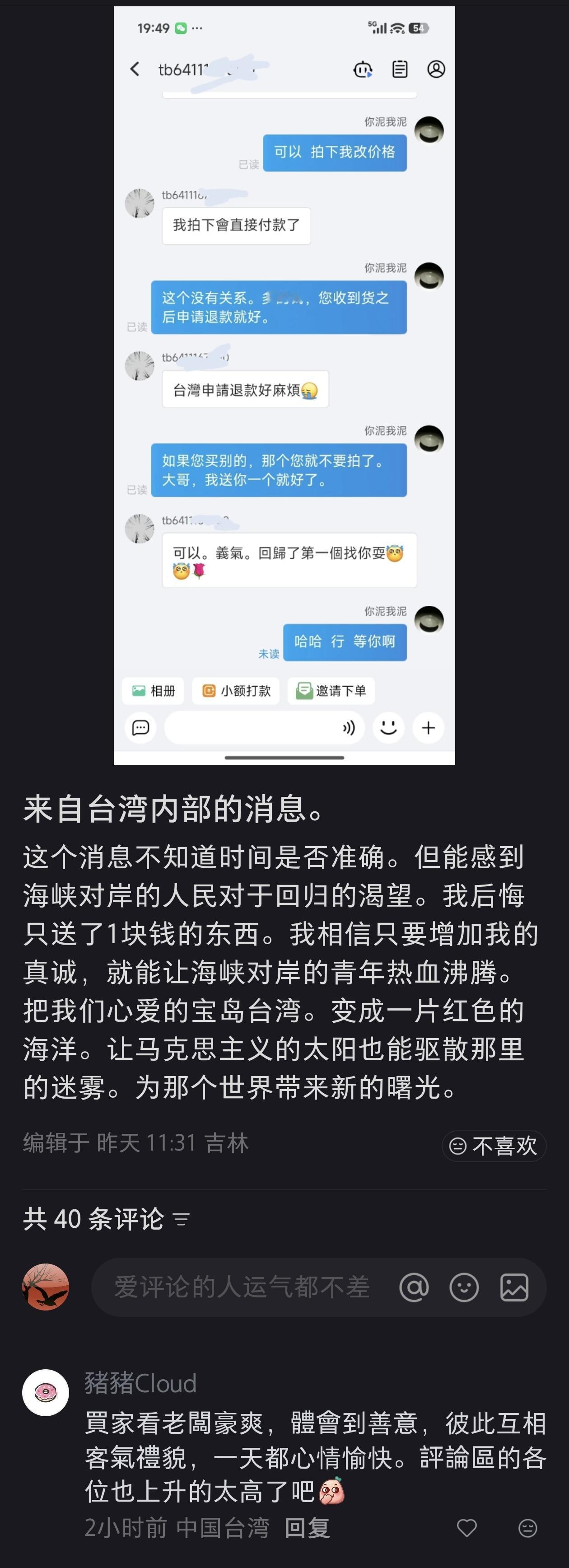 台湾省一位网友网购大陆产品,一来一去沟通交流,竟然产生了意想不到的效果。看完竟然有一丝丝感动。