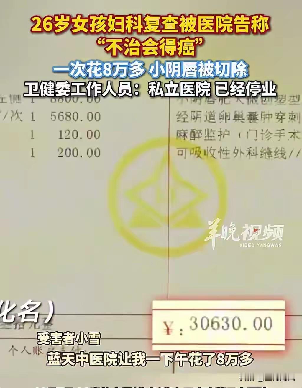 真是丧心病狂 26岁女孩去私立医院妇科复查 被医生告之“不治会得癌” 女孩在恐吓和忽悠之下 一次花8万多 做了小阴唇切除手术 目前卫健委已介入 医院已停业 这种医生 真是害人不浅呀 没病说有病 小病说大病 简单病说复杂病 害群之马必须绳之以法 这女孩也太草率从事了 怎么不多去几家医院复诊 再来确定需不需要手术呢 切除小阴唇这么大的事 居然敢在这样的私立医院做手术 真是够大胆的 如今悔之晚矣 真令人惋惜 原创作品 搬运必究 图源网络 若侵即删