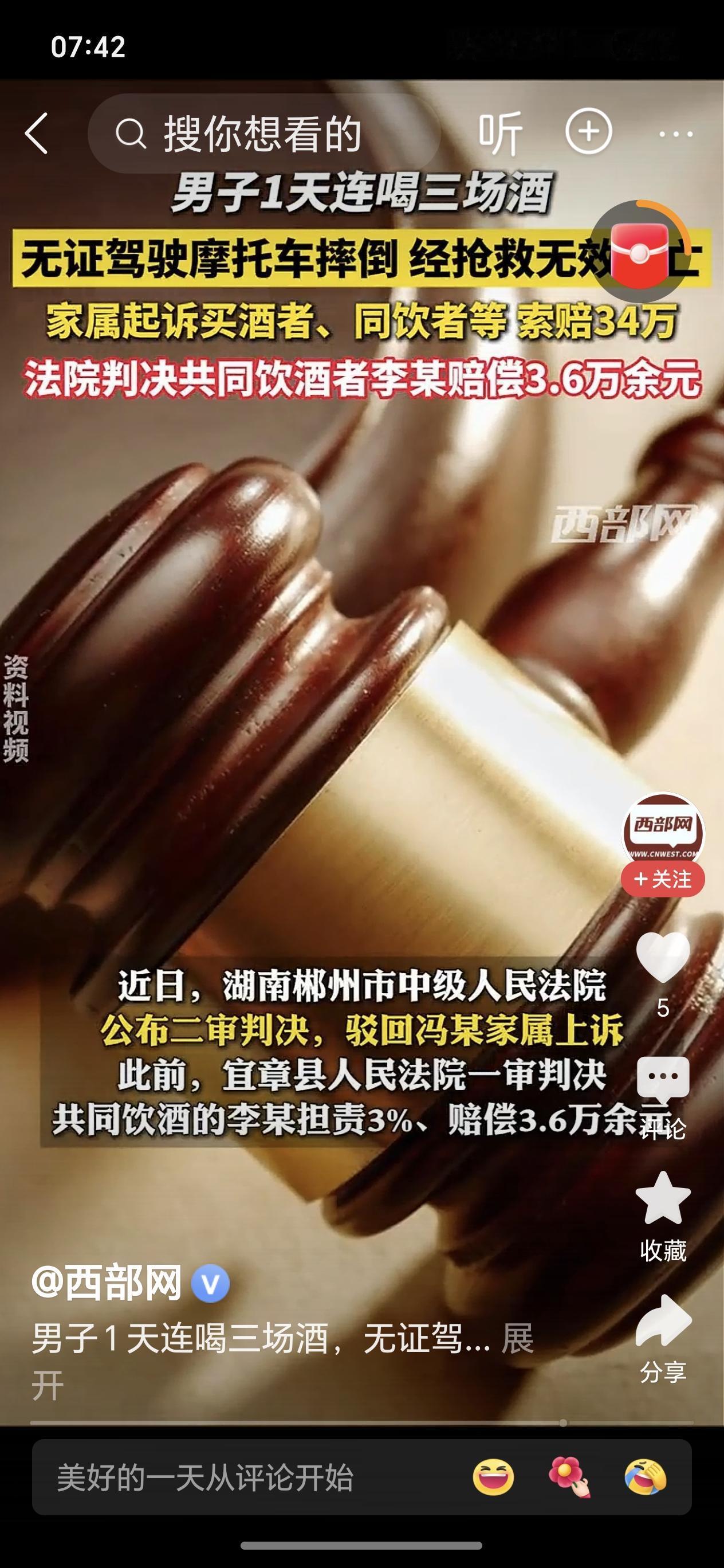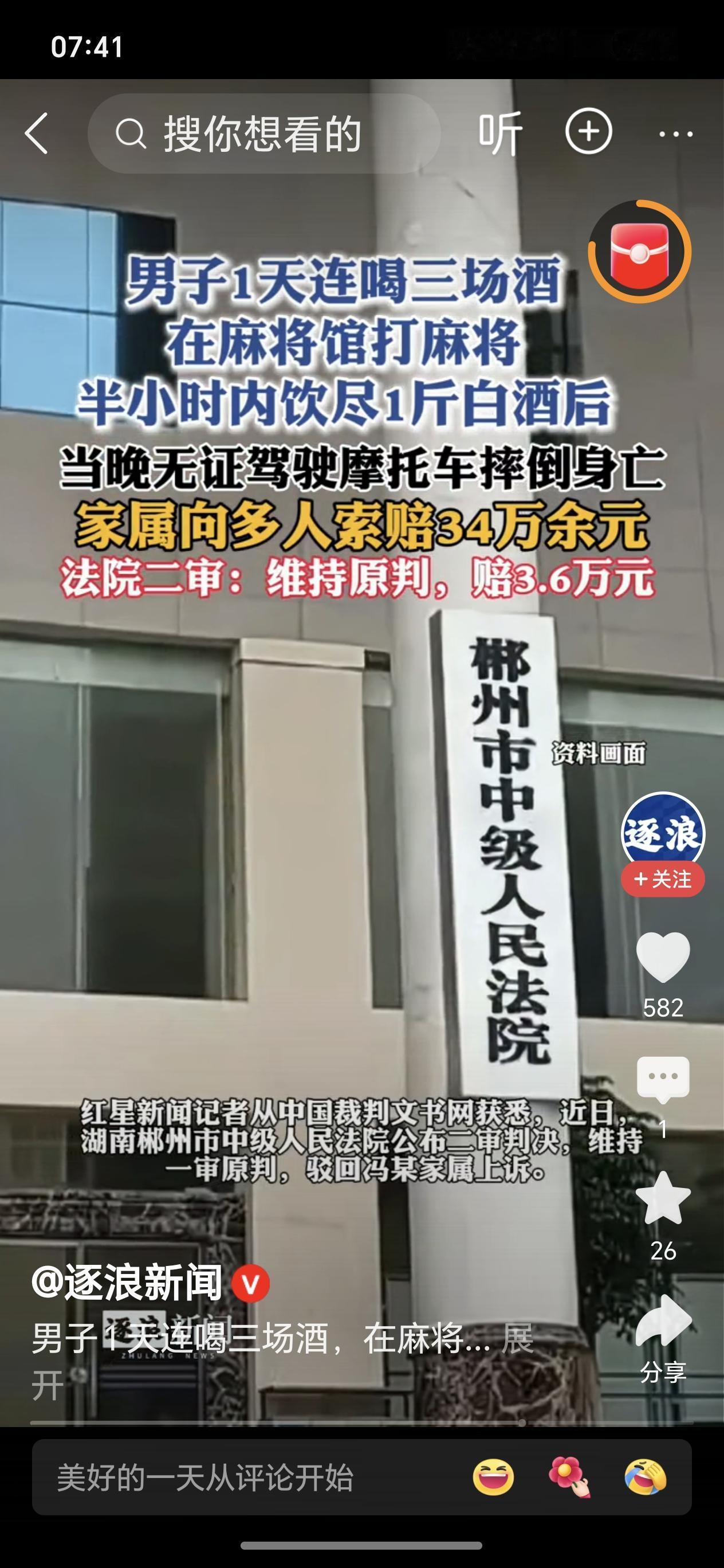 家属索赔34万男子从中午到晚间连喝三场酒,最后那场酒在麻将馆喝的,酒后男子无证驾驶摩托车回家途中摔倒后死亡,家属将共同饮酒者、帮其买酒者及麻将馆经营者多人告上法庭,要求赔偿34万元, 最终法院只判在麻将馆与其饮酒之人因未提醒少饮及未履行安全义务承担3%的责任,赔了3.6万! 饮酒男子是成年人应该对自已的行为负责,一天内居然饮酒三场,还无证驾驶是对自身安全的极端漠视,家属还要求别人赔偿实在是无理甩锅! 最后与男子饮酒者够倒霉,只能花钱买个教训吧!