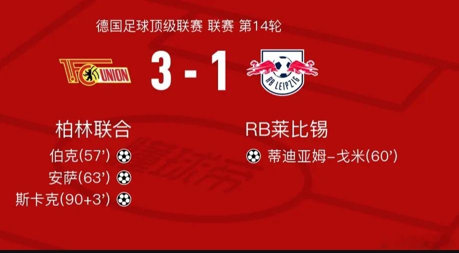 柏林联合3-1RB莱比锡,斯卡克、安萨破门北京时间12月13日德国足球顶级联赛 联赛 第14轮,柏林联合主场对阵RB莱比锡。柏林联合伯克破门,安萨破门,斯卡克破门。RB莱比锡蒂迪亚姆-戈米破门。最终比分柏林联合 3-1 RB莱比锡。柏林联合vs莱比锡足球的魅力体育
