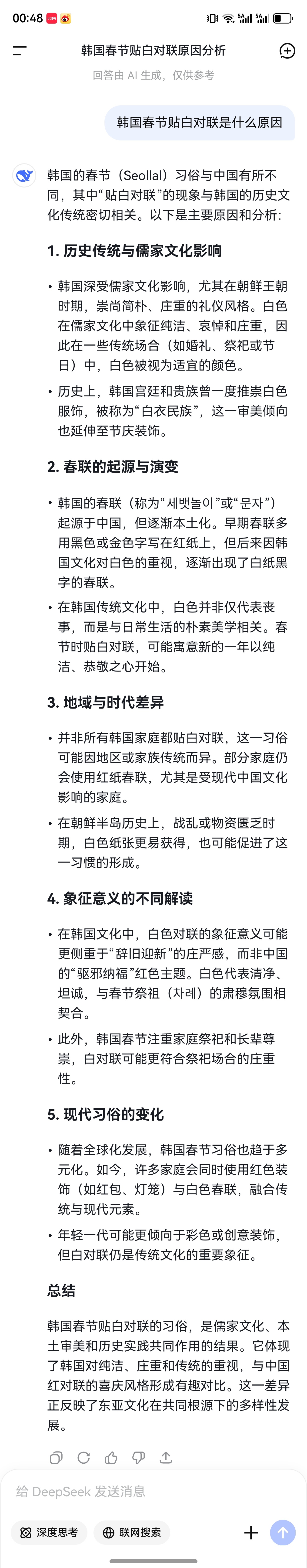 关于泡菜春节贴白对联的成因,问了两个AI,答案都是跟崇祯没有关系。