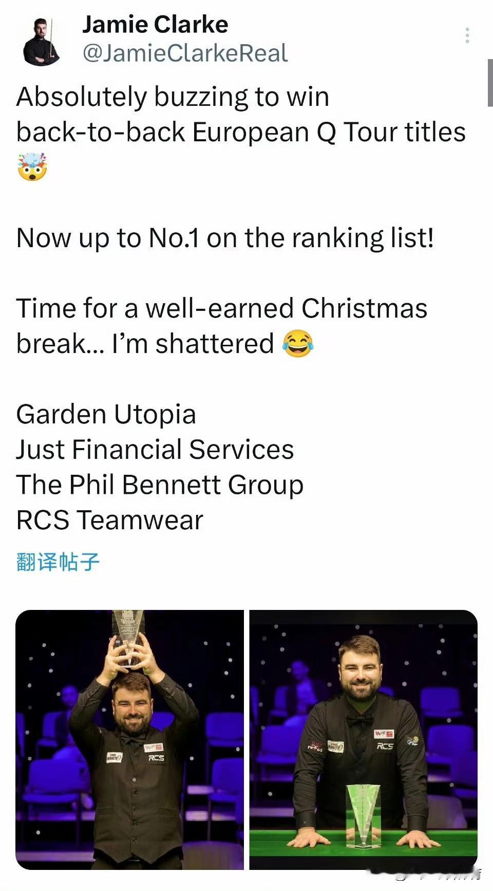 斯诺克:Q Tour第五站保加利亚站,杰米·克拉克以4-2战胜卡灵顿,连续两站夺冠!目前他的Q Tour排名上升到第一位,有望重返职业。