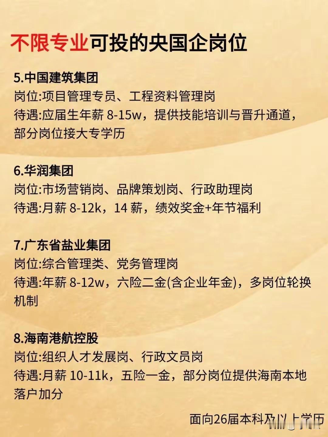好机会来了!这8家央国企这些岗位的招聘不限制专业汇总合集!25、26届毕业生即可报名!8家企业都是央企大平台,中国南水北调集团、国家石油天然气集团、国家能源集团等等;开放的岗位有很多,比如行政岗位、新闻宣传岗位、工程调度岗位等等。条件非常优越,条件非常宽松。有才你就来!速速围观揭秘详细内容![来看我][来看我][点亮平安灯][点亮平安灯] @叮咚云—将持续为你分享最有价值的就业趋势分析和行业洞察,提供志愿填报、就业咨询、职业规划经验指导![来看我][比心][比心] 免责声明:图片来自网络,仅供参考! 央国企求职条件 国企为什么喜欢招应届生?