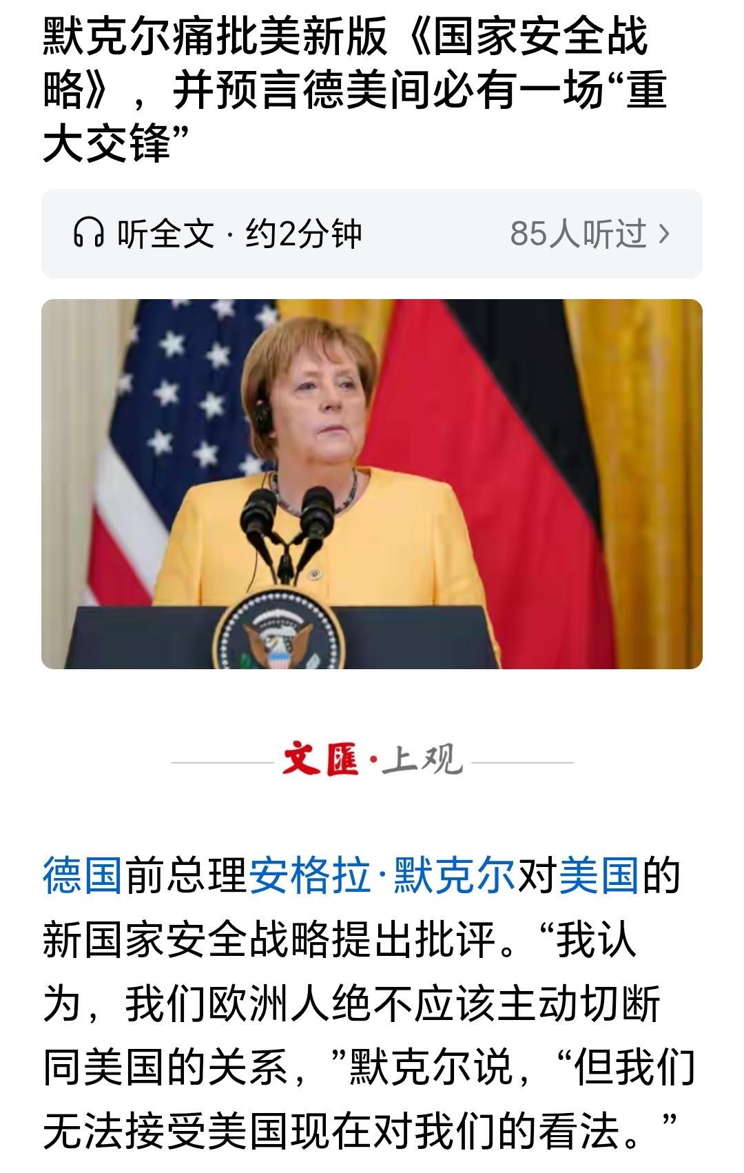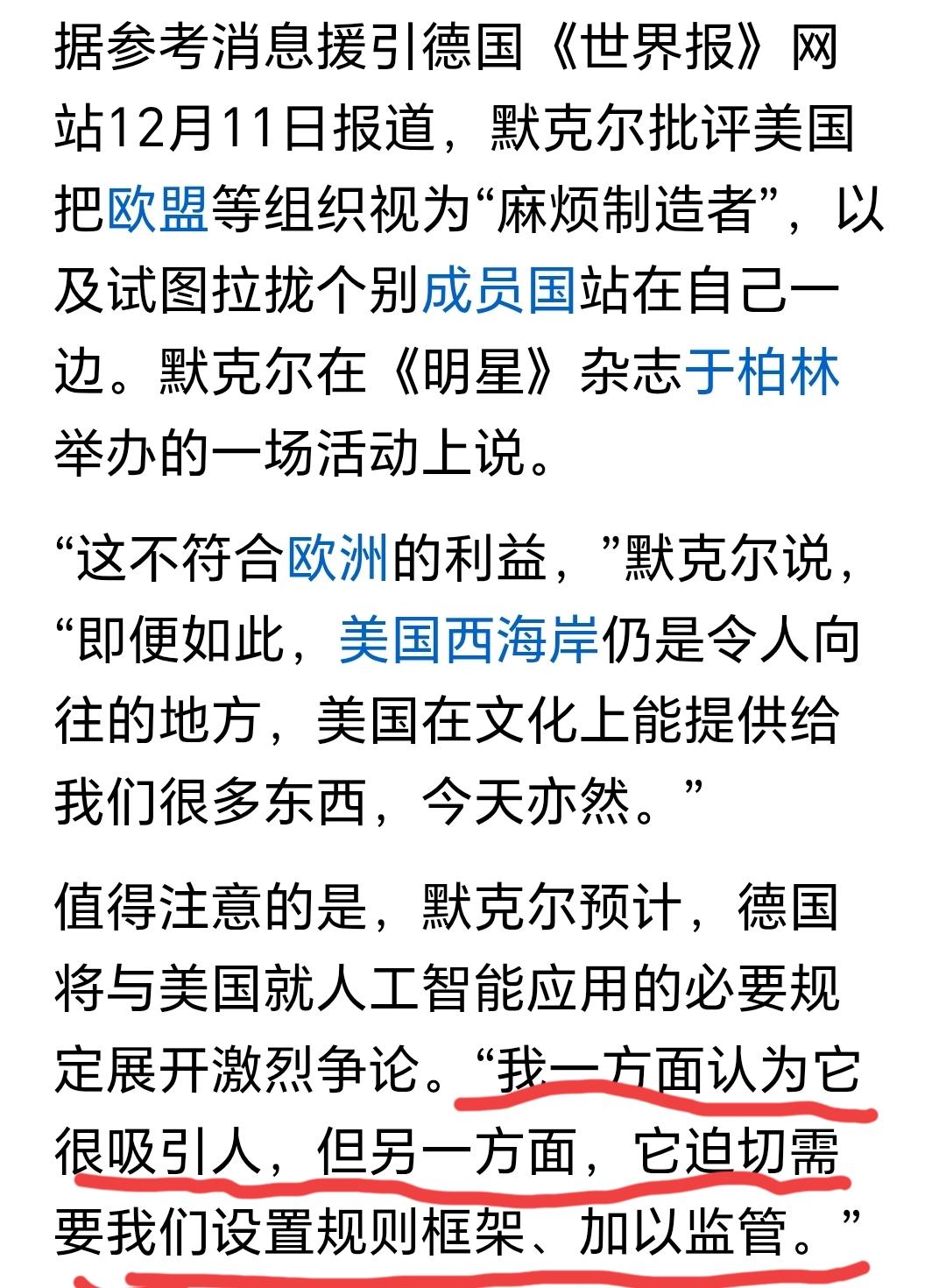 看来默大妈是真不喜欢税宗啊。台上硬刚,台下还是继续批。除开个人情感以外,默大妈的话背后展现出德国的焦虑。 焦虑一是怕被美国的抛弃。以欧洲不能被美国抛弃为幌子,实际上是怕美国选择了欧洲其他国家作为合作伙伴而抛弃德国,这样德国作为欧洲的领头羊的地位将不保。 焦虑二是在科技发展日新月异的今天,尤其是决定国家未来的人工智能赛道,德国会被中美两国甩开。所以德国必须要能坐上桌而不是被端上桌。 一句话,默大妈想要德国需要保证拥有决定游戏规则的权力。 其实换个角度看,这也能看到美国真正的实力。 点右上角关注我,我们一起去看这个魔幻的世界