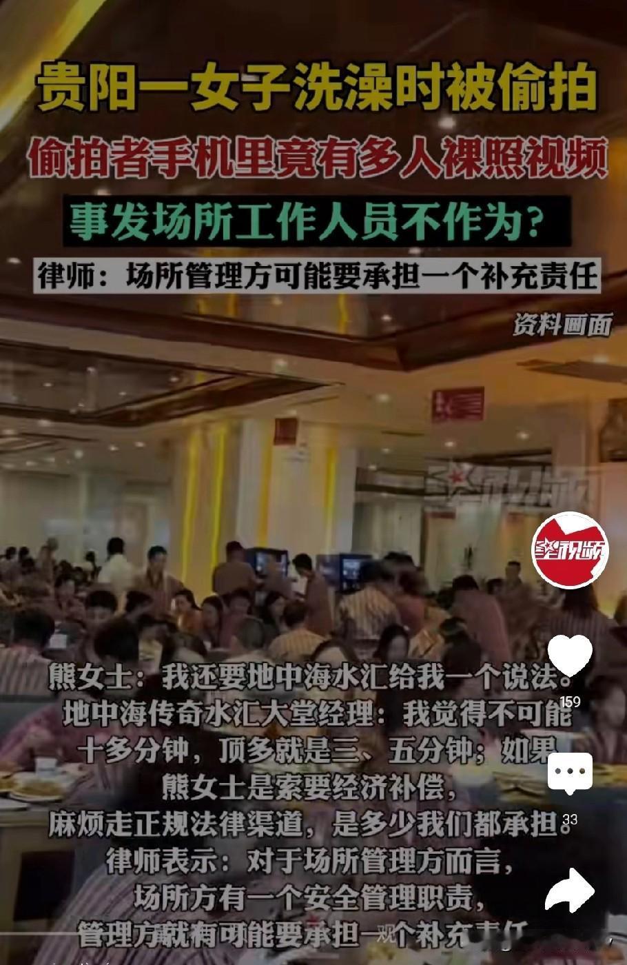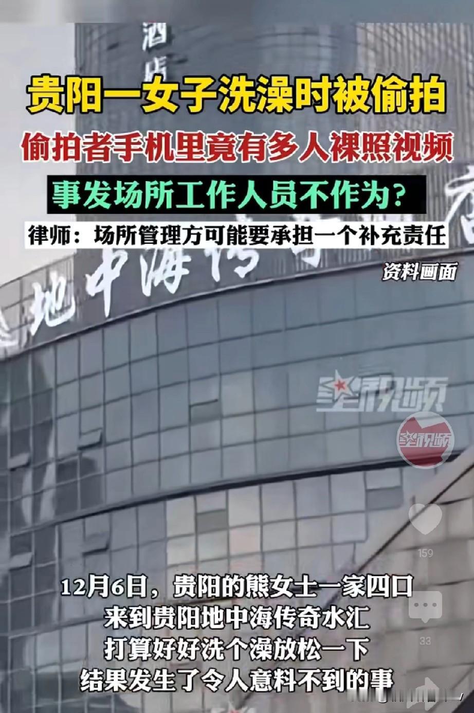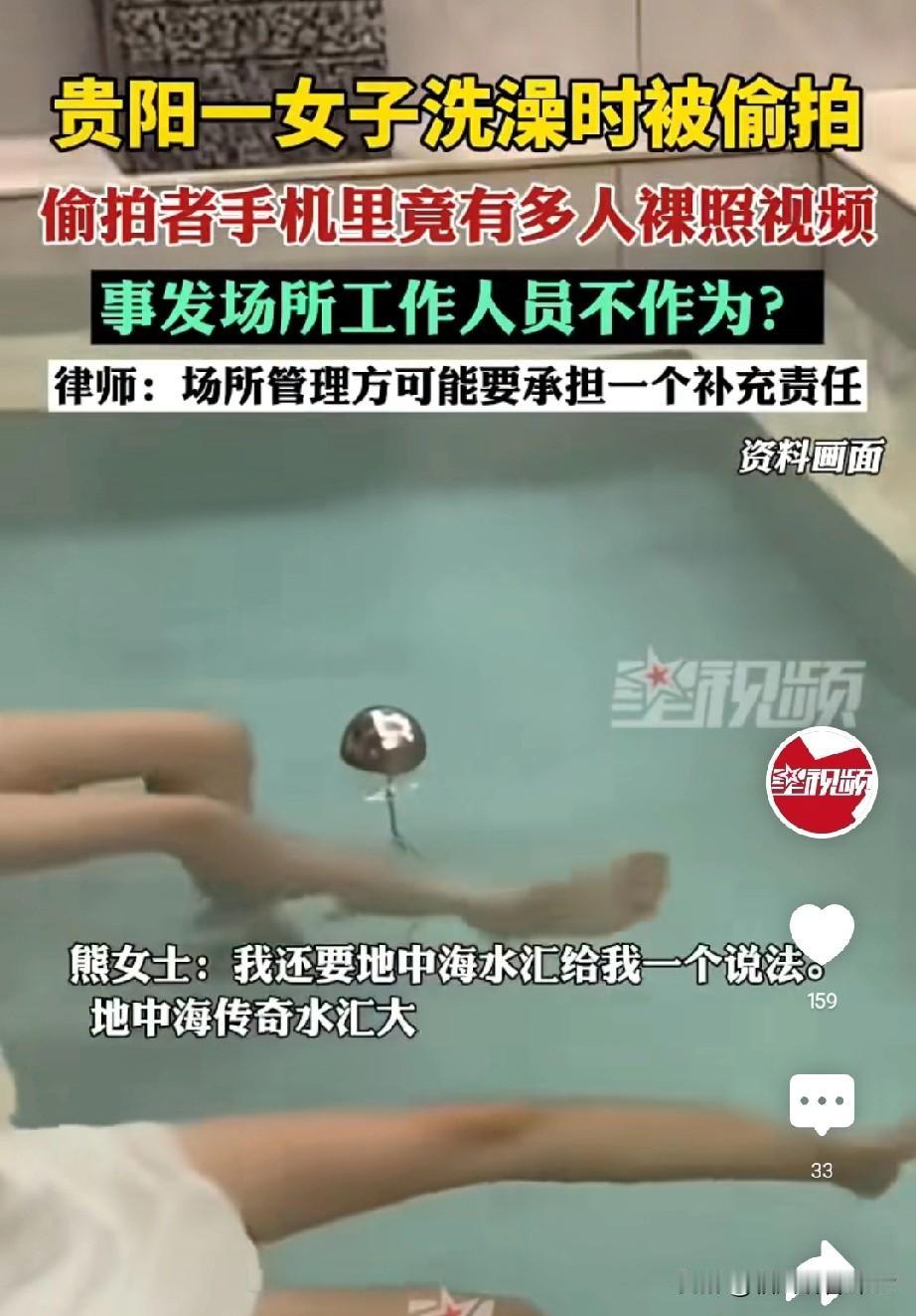 老年女子澡堂偷拍,手机里藏数十段女性裸照视频还想转发好友?贵阳这场闹剧刷新三观! 12月6日,熊女士一家四口到贵阳地中海传奇水汇泡澡放松,冲水时不小心溅到邻位阿姨身上,转身道歉时竟瞥见对方手机里全是自己的裸照。 熊女士当场冲上去抢手机,双方拉扯十多分钟,她一边护着孩子一边阻拦对方删证据,全程没见到任何工作人员上前帮忙。 民警到场后查出关键证据,涉事阿姨杨某某的手机里不仅有熊女士的影像,还有多名陌生女性的隐私视频,部分已转发给他人,最终她被行政拘留7天。 水汇大堂经理回应称“最多争执三五分钟”,提出免本次门票+赠三张门票的解决方案,被熊女士拒绝,她坚持要经济补偿,商家则让其走法律途径。 律师明确表示,根据民法典1198条,公共场所经营者有安全保障义务,水汇未尽到管理责任,需承担补充赔偿责任。 网友炸了锅,有人痛骂偷拍者为老不尊,有人吐槽水汇巡场形同虚设,更有人担忧“花钱去放松,却成了别人镜头下的猎物”。 你觉得水汇该给熊女士经济赔偿吗?遇到公共场所偷拍,你会第一时间怎么做?