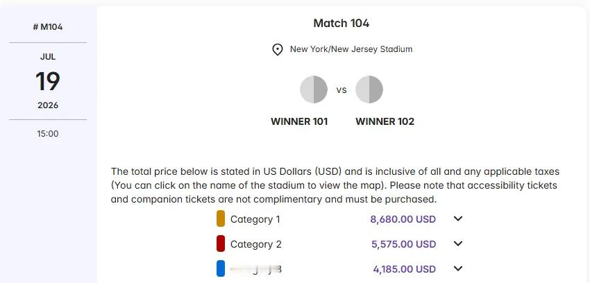 世界杯官方票价最高可达6.12万 根据FIFA官网上的定价表,世界杯决赛的“经济票”起价为4185美元(约合2.95万元人民币),“标准票”为5575美元(约合3.93万元),“高端票”则为8680美元(约合6.12万元)。克罗地亚足协表示,如果一位克罗地亚队的球迷从克罗地亚队的第一场比赛看到决赛(若打入决赛),则至少需要花费6900美元(约合4.87万元人民币)——是2022年卡塔尔世界杯观赛成本的五倍。