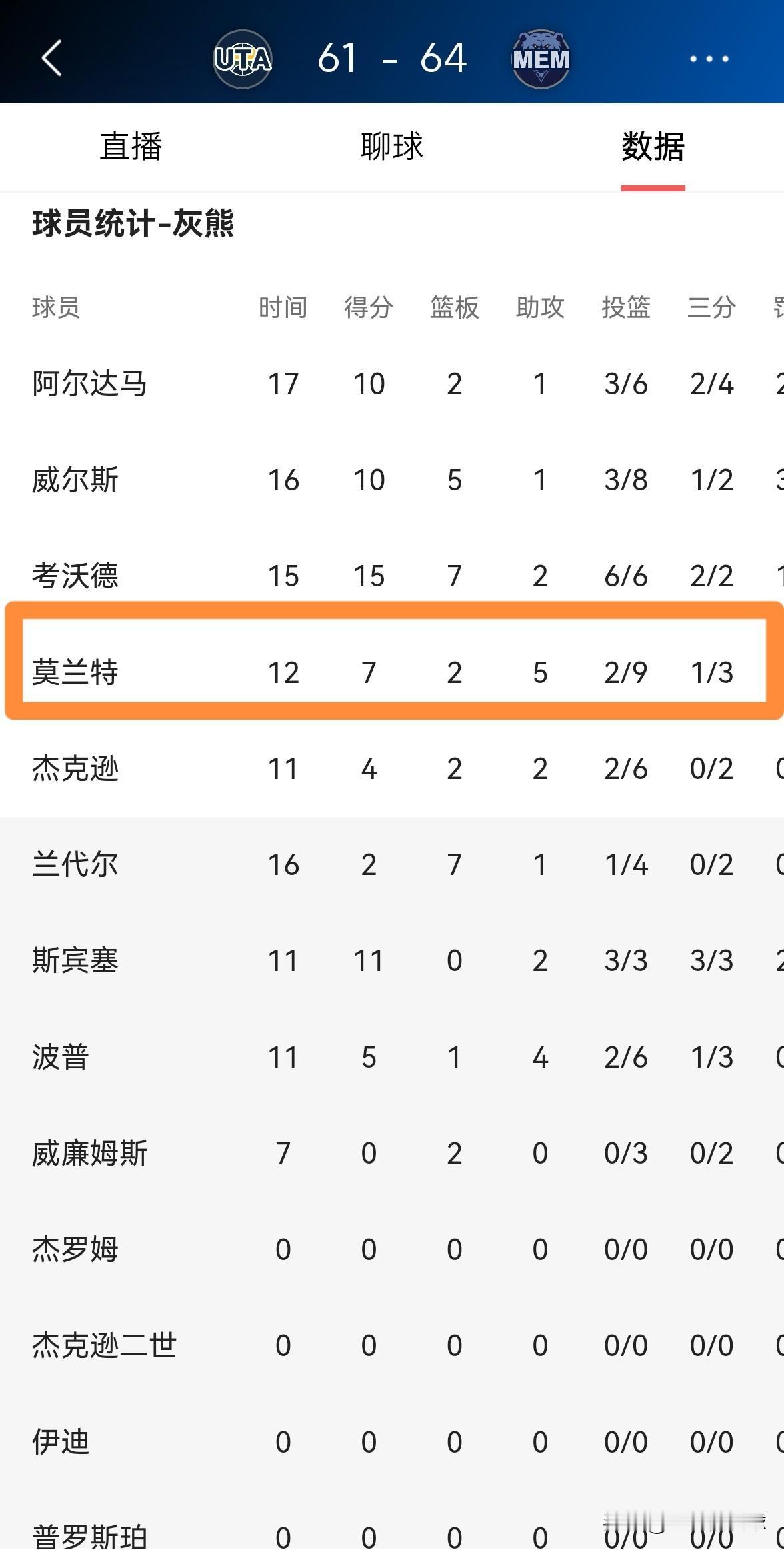 灰熊当家球星莫兰特真是太拉胯了!在今天灰熊主场迎战爵士的比赛中,目前双方半场战罢,灰熊以64:61领先对手。让人感到非常失望的是,在前两节比赛中,莫兰特的投篮手感异常糟糕,他在首发出战的12分钟里,投篮9中2,其中三分球3中1、罚球3中2非常低效的得到7分,他的场上正负值为全队第二低的-6。 作为灰熊的绝对核心,莫兰特在上半场比赛中的表现真是让人失望透顶,如果莫兰特不上场的话,我相信灰熊的领先优势会更大。